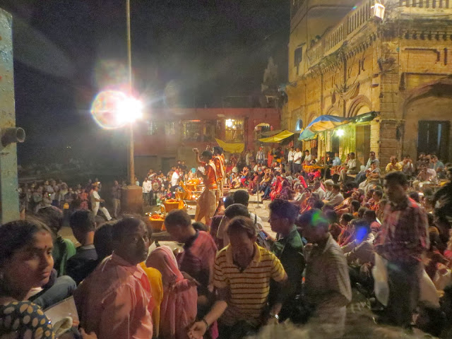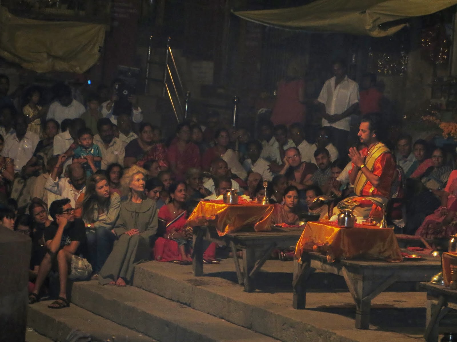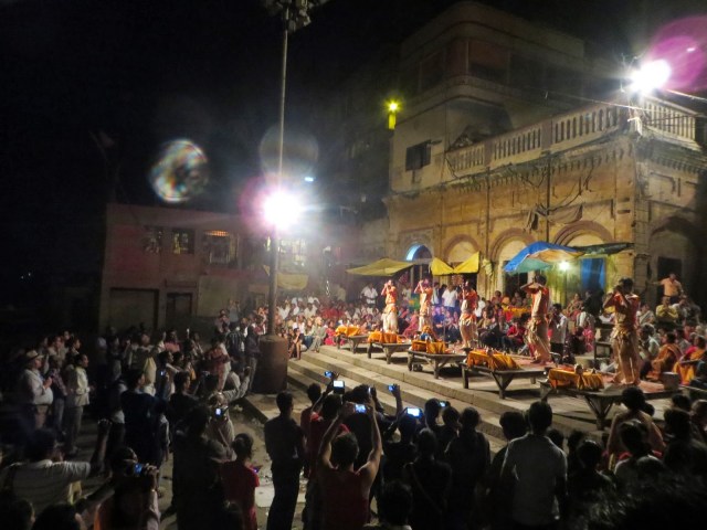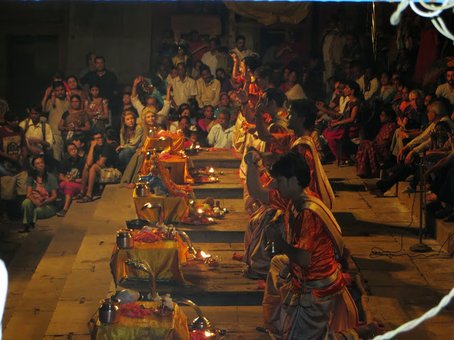 Cuando terminamos de hablar nos invitó a visitar los ghats y a acudir a la celebración que hay cada anochecer en el ghat principal Dasaswamedh Ghat que se llama Ganga Aarti Puja (Una puja es una ofrenda) , en este caso hacen ofrendas florares á Brahma y Shiva. Esta celebración congrega a cientos de locales y turistas para ver un espectáculo de fuego, luces, baile tradicional y música. Un espectáculo digno de ver y que además es gratutito.
