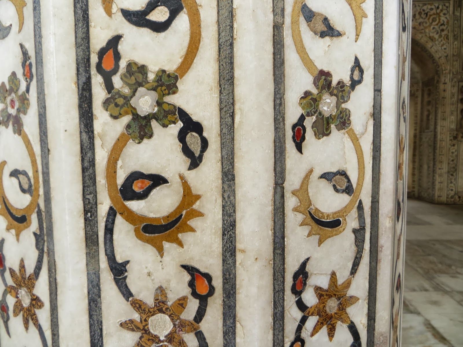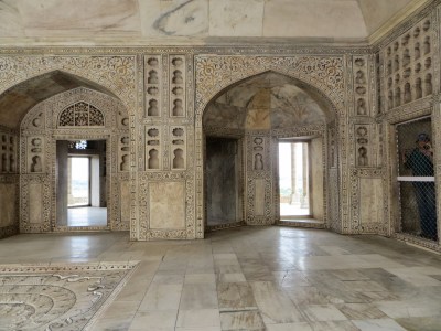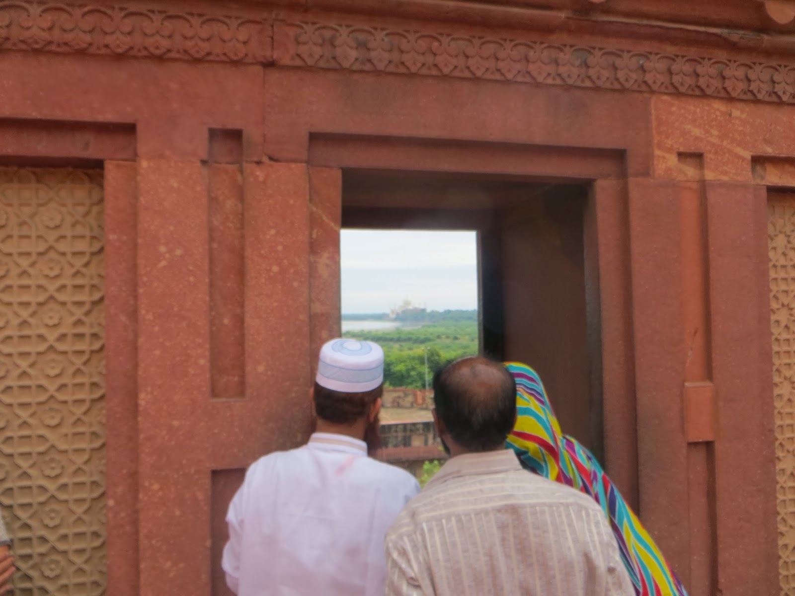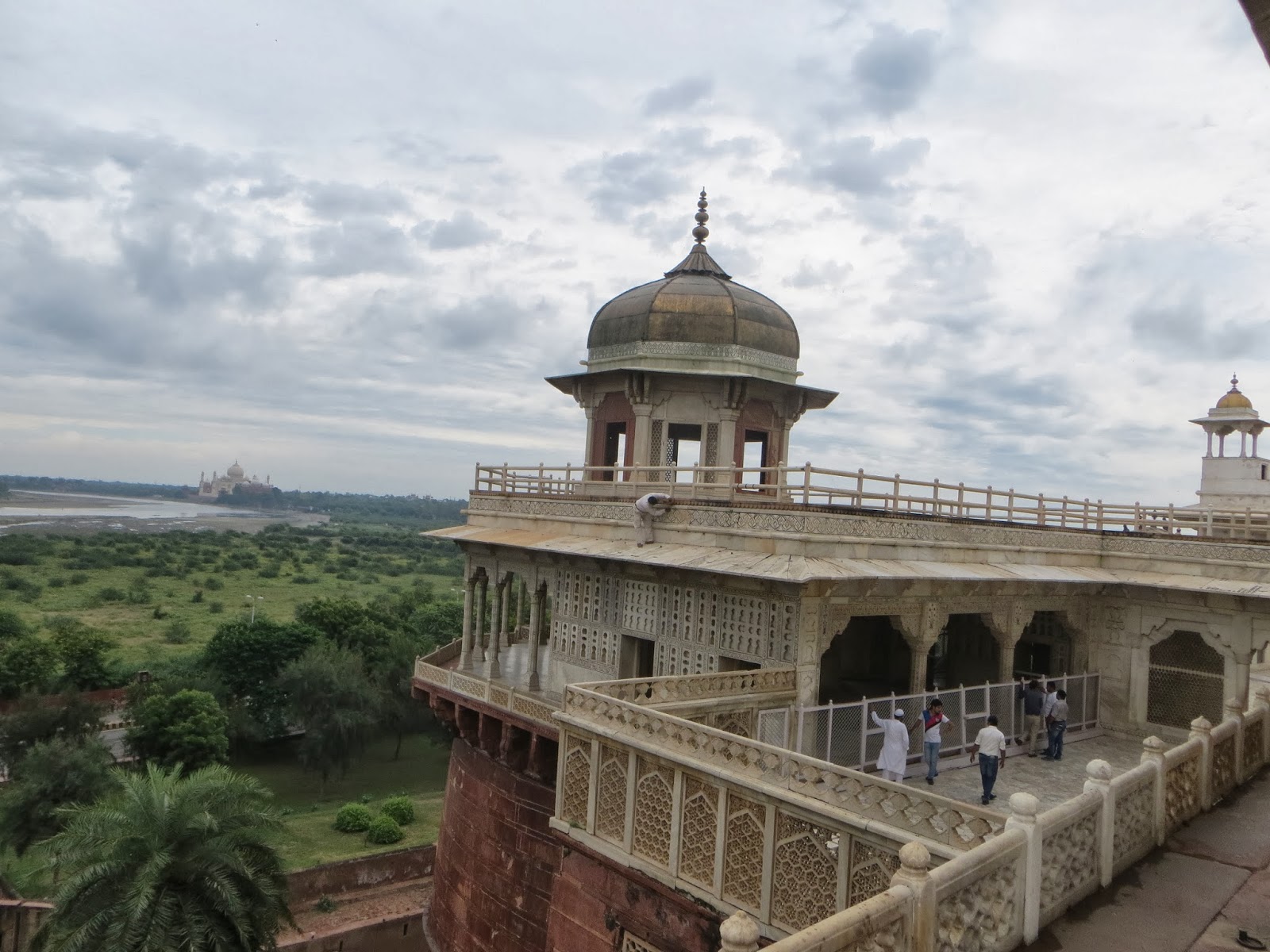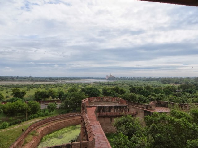 Desde el fuerte de Agra se ve a lo lejos el Taj Mahal y al otro lado del río Yamuna se ve la plataforma donde habría de ubicarse el panteón del emperador y que nunca llegó a construírse, justo en frente del de su esposa preferida, conocida como Mumtaz Mahal.