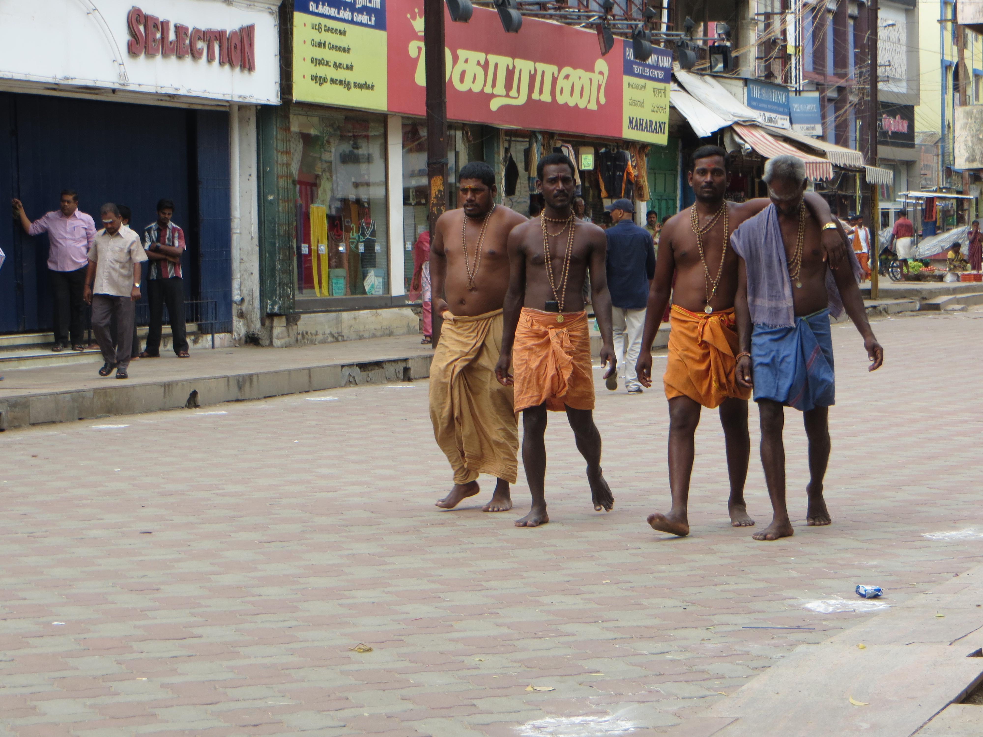 3- los indios usan falda sobre todo si viajas al Sur de la India verás que muchos hombres van en dhoti o falda-pareo, la misma falda puede llevarse en su versión maxi o convertirse en mini anudándola a la cintura; esta indumentaria es fresca y cómoda para trabajar, así que la verás trabajando en el campo, en una obra… o simplemente paseando por la ciudad o para acudir al templo.