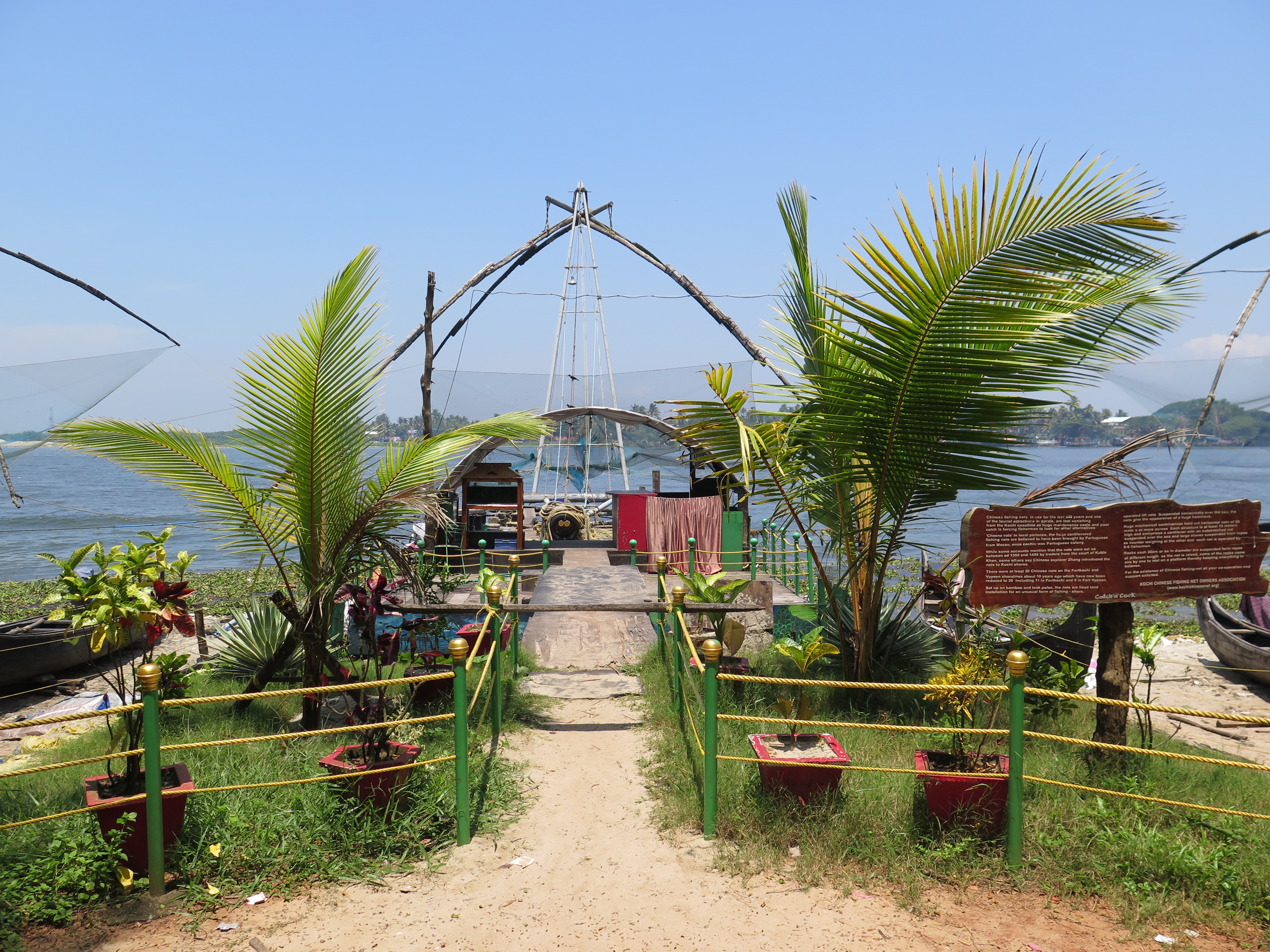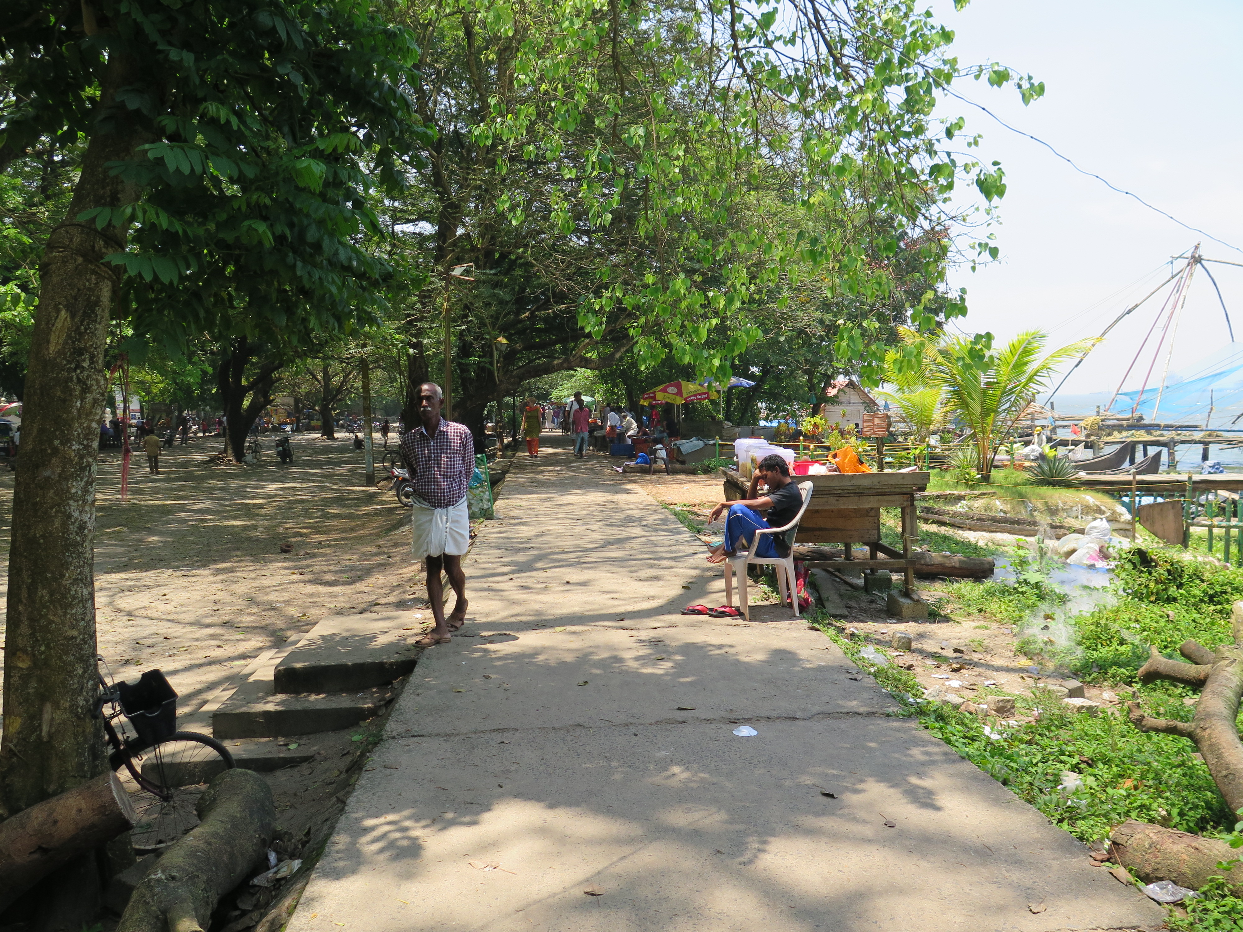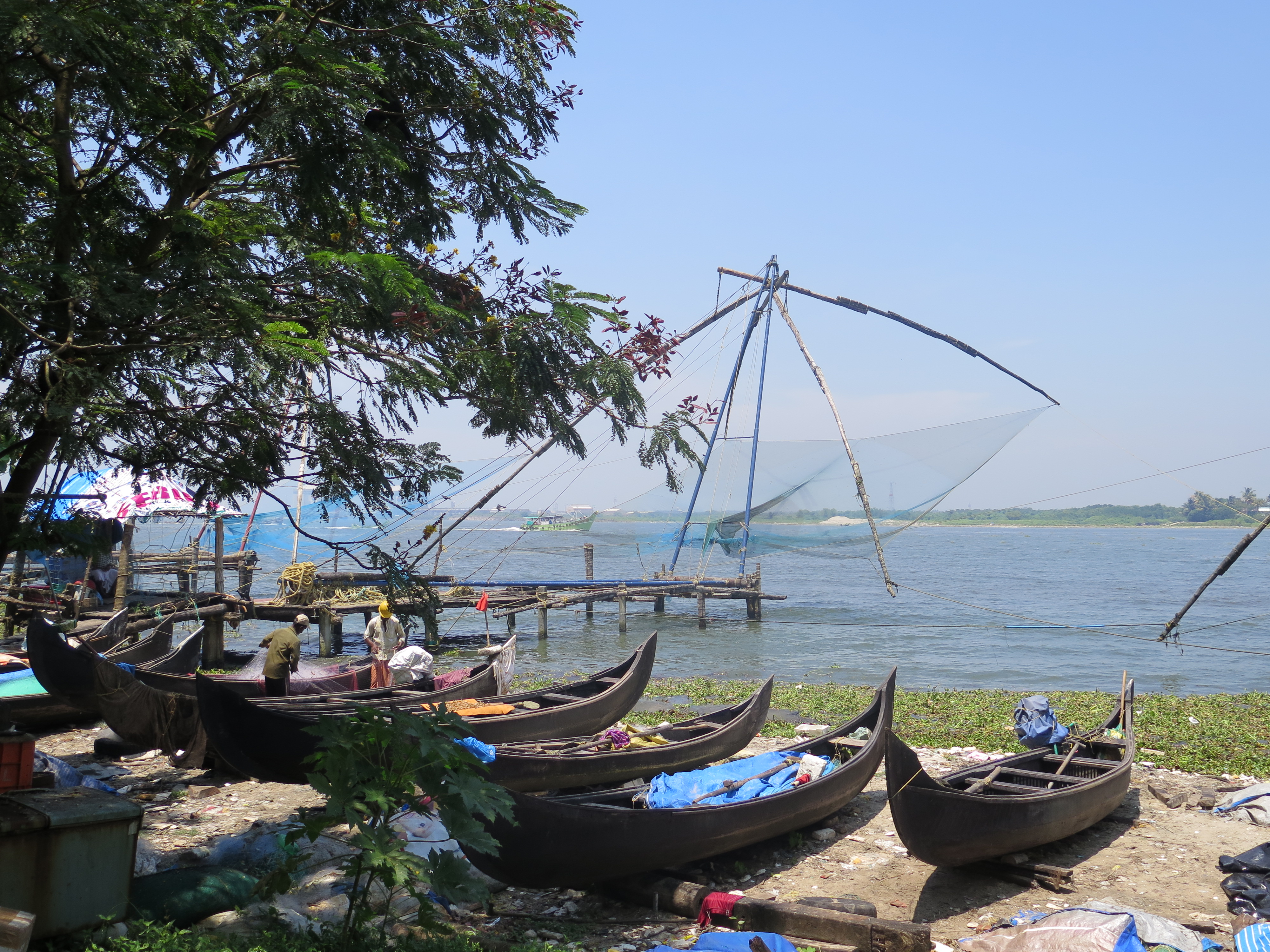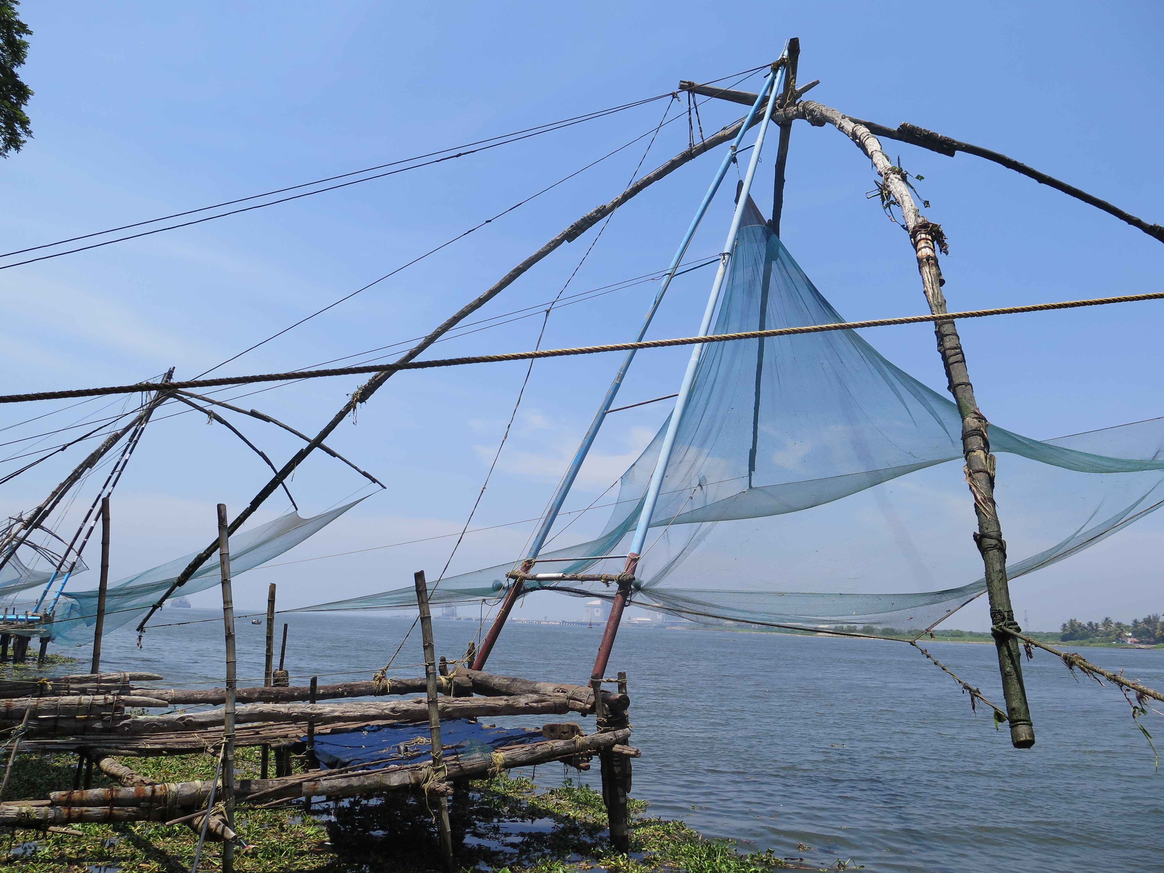 Fort kochi y sus impresionantes redes de pesca portuguesas. Cuando llegas a Fort Kochi te encuentras con una gran avenida al lado del puerto donde por supuesto hay un mercado lleno de vendedores y luego gente que trabaja preparando sus barcas o se sienta a descansar mirando al mar; nos hicimos fotos con las redes y regateamos porque había cosas realmente interesantes y además era el último sitio donde podríamos comprar algún regalito en la calle…