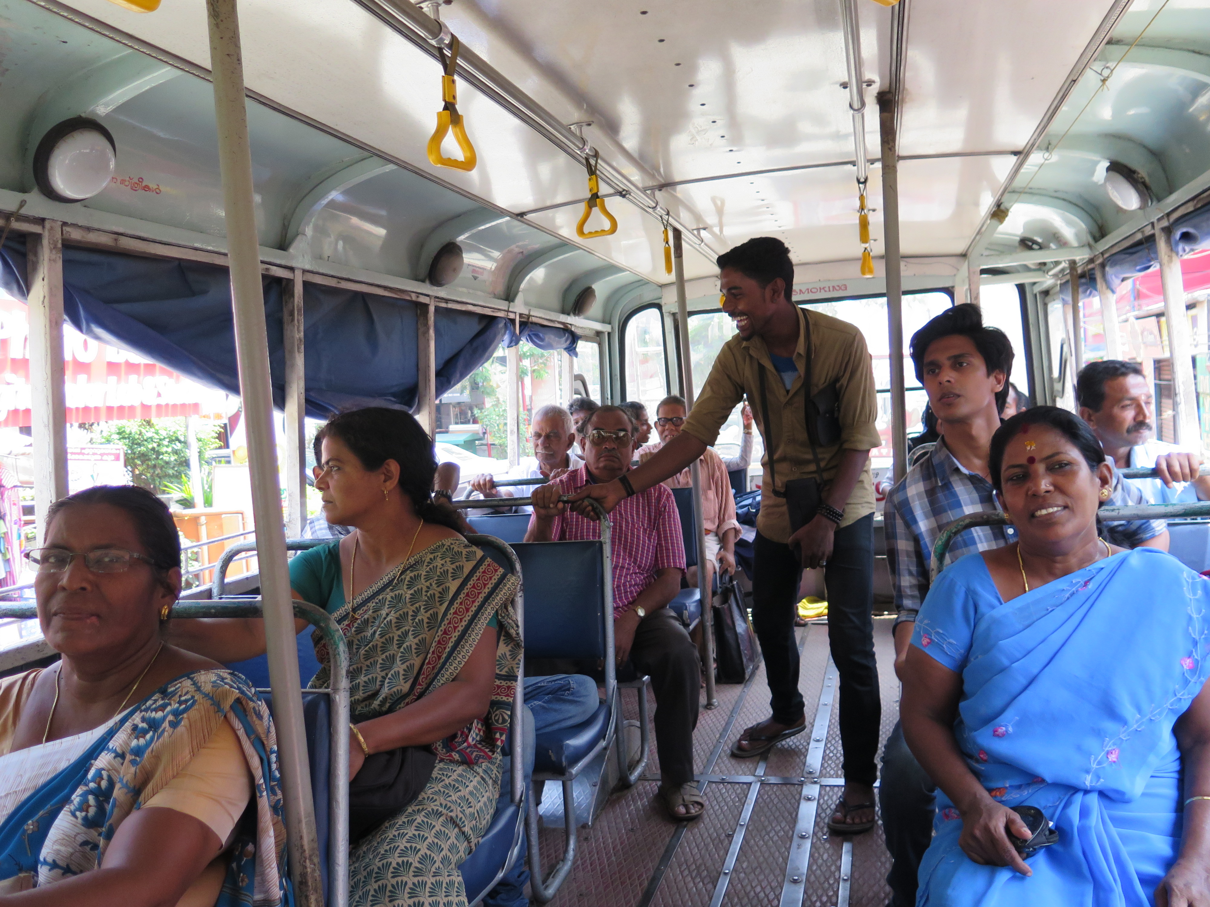 Llegamos a Cochín en autobús desde Allepey, después de haber pasado un día entero en los Backwaters. Pensar que al principio cuando veía los autobuses en India, tan sucios por fuera y tan viejos, me daba hasta miedo entrar, pero después de que viajas en varios ya ves que todo es normal, se te olvida la suciedad y aunque a veces vas algo apretujada, hay buen ambiente y no se viaja mal 🙂