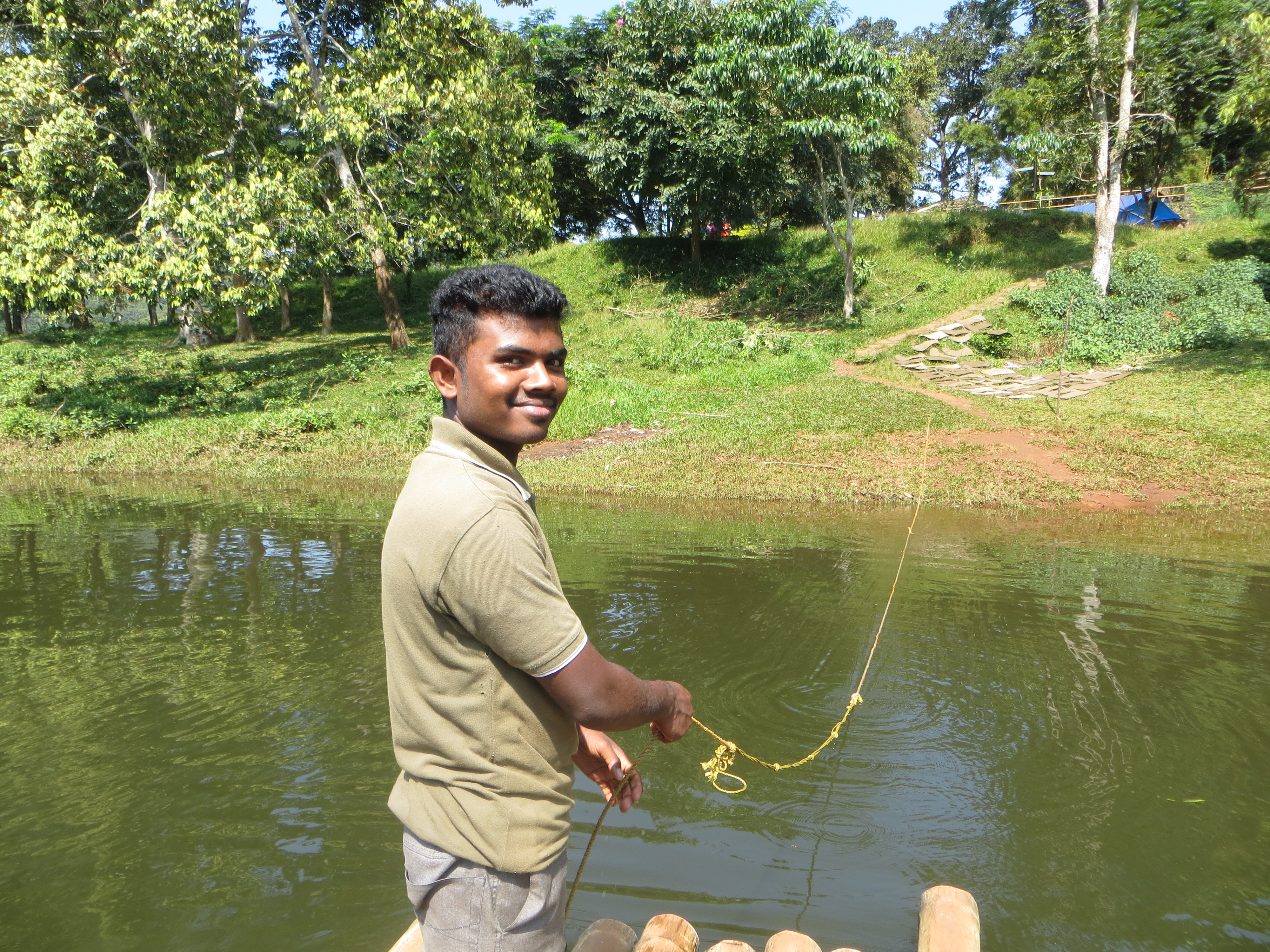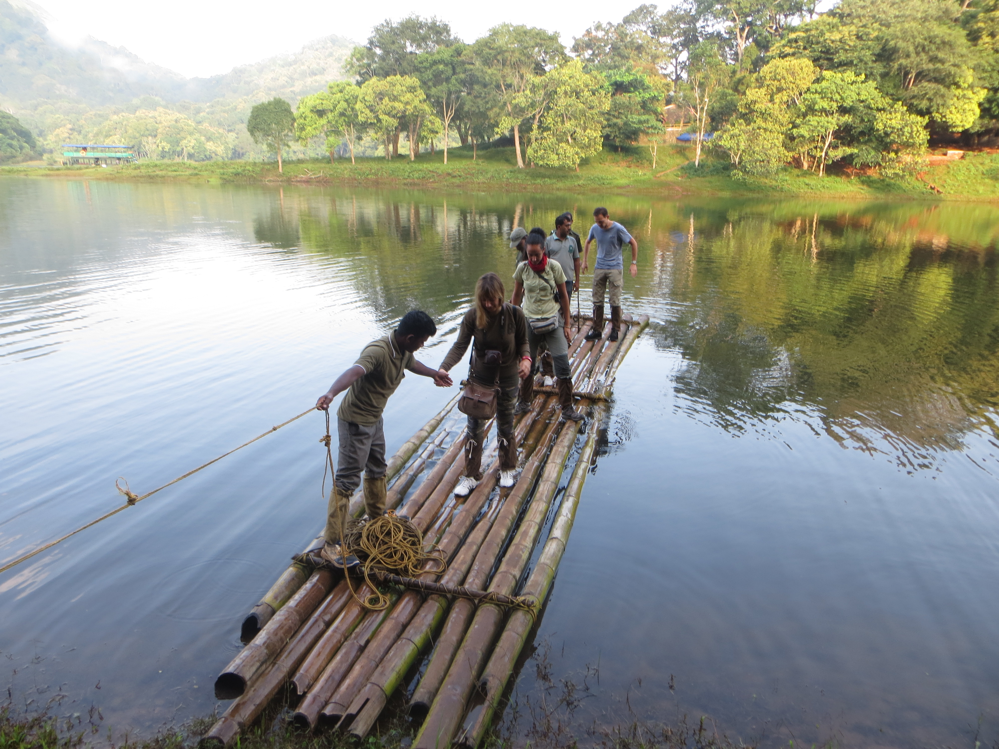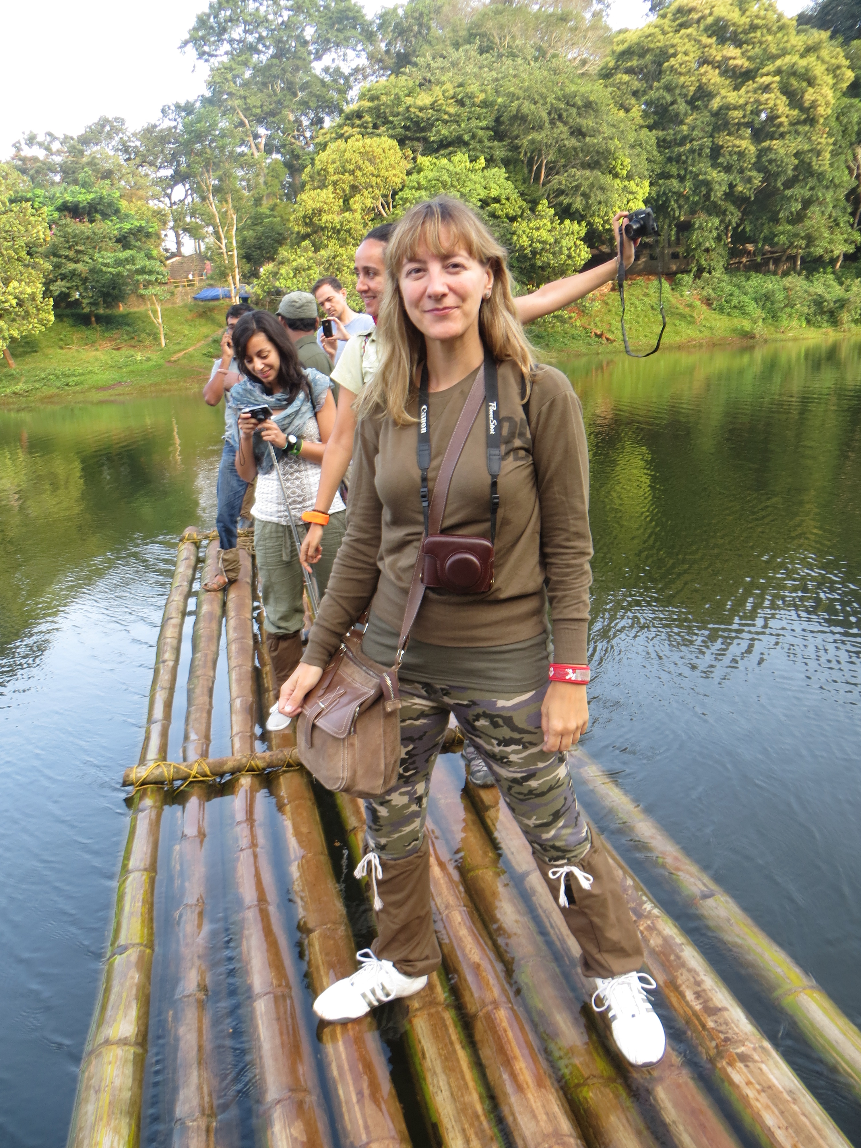De repente nos vemos delante de una balsa hecha con caña de bambú y nos dicen que tenemos que subirnos ahí para cruzar el lago… Nosotras cuatro, los dos guías y el chico inglés que cenaba sólo la noche anterior en Tekkady. Yo como soy tan bien mandada además de algo inconsciente, ya estaba dipuesta a subir cuando oigo decir a Mayca _ Yo ahí no subo… y digo_ Por qué? _ En este bolso llevo todo; la cámara, el pasaporte, el dinero la tarjeta de crédito…y si nos caemos ahí… ¡Ni lo habia pensado!!! Yo siempre he sido una inconnsciente; creo que es por eso que vivo tan feliz!!! :O Pero claro; aún oyendo cosas tan obvias pensé…¡maloserá! y al final subimos todos en aquella balsa que se hundía bajo nuestro pies y llevabamos los pies totalmente encharcados de agua…