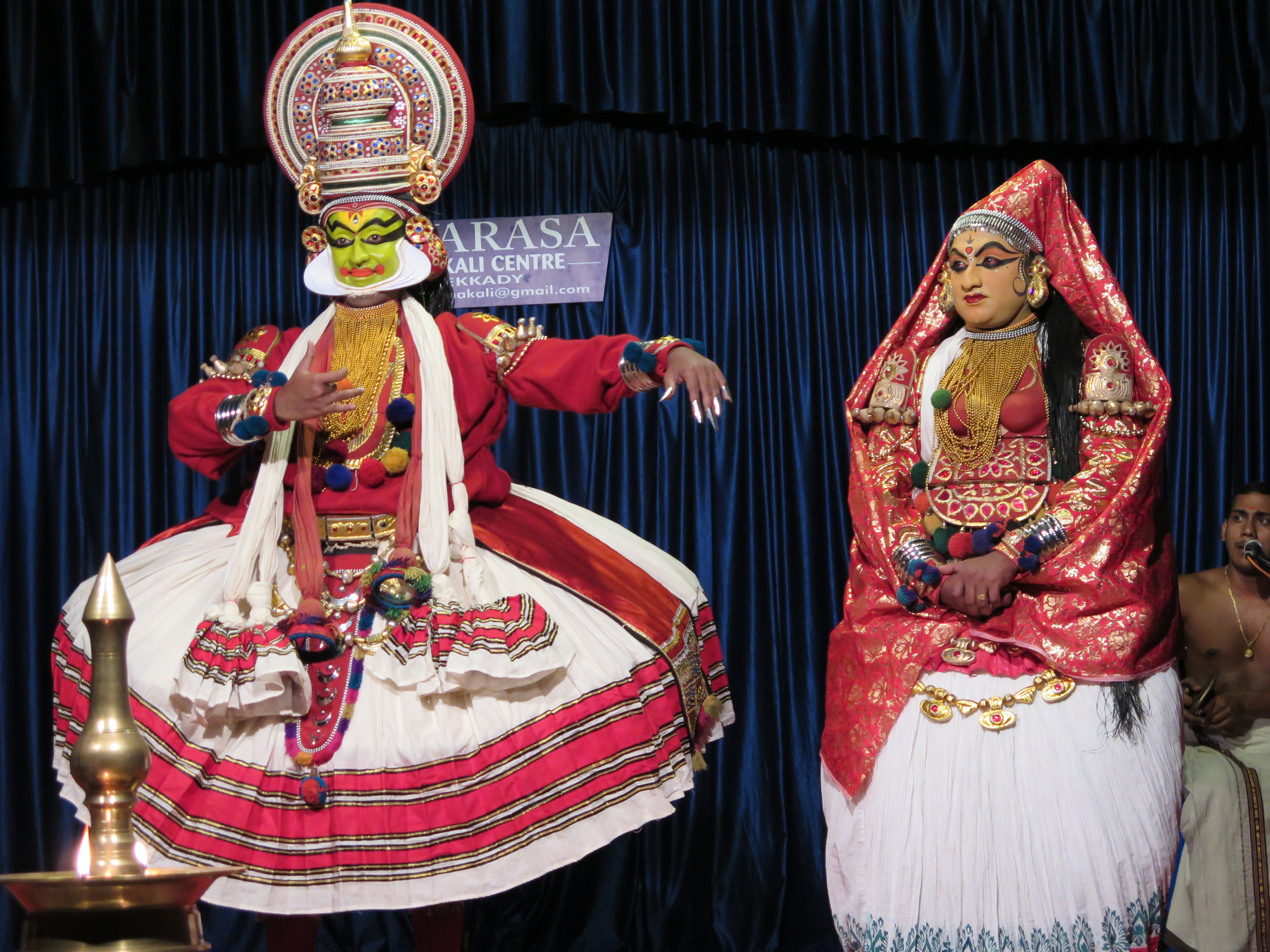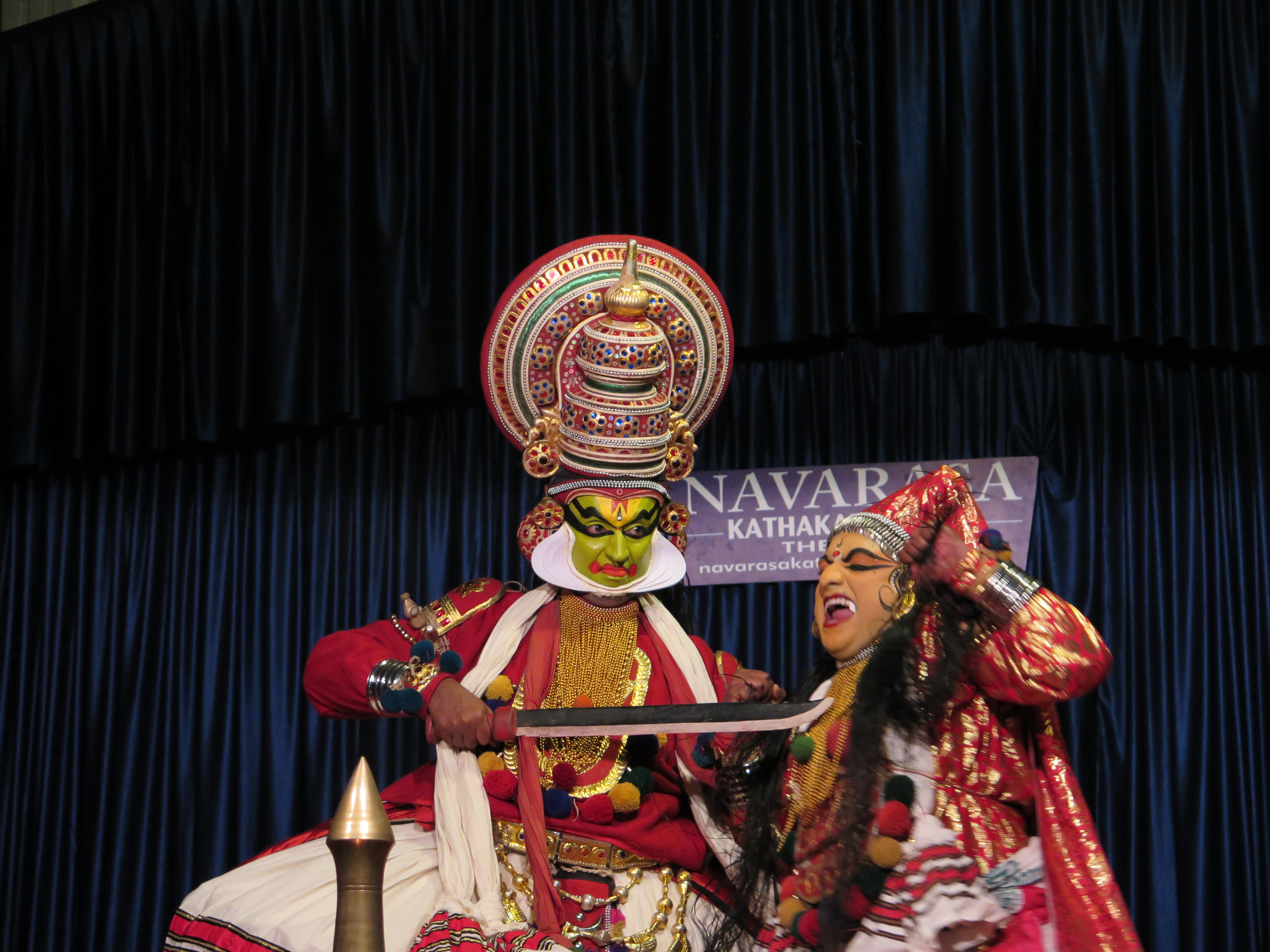 Cuando llegamos a Tekkadi ya había anochecido y nuestro conductor nos preguntó si nos apetecía hacernos un masaje ayurvédico o ir al teatro (Dos de las mil cosas que no puedes perderte en Kerala)…Lo del masaje ayurvédico lo habíamos dejado para Varkala, porque en Varkala pensábamos dedicarnos a la vida placentera; masajes, playa, mercadillos 😉 Así que preferimos ir a la representación de Teatro kathakali, que es originario de Kerala y una de las artes escénicas más antiguas que se conocen. En ellas se trata de representar sin mediar palabra, sólo con gestos y acompañamiento musical las historias de las grandes epopeyas hindúes : El Ramayana y el Mahabarata.