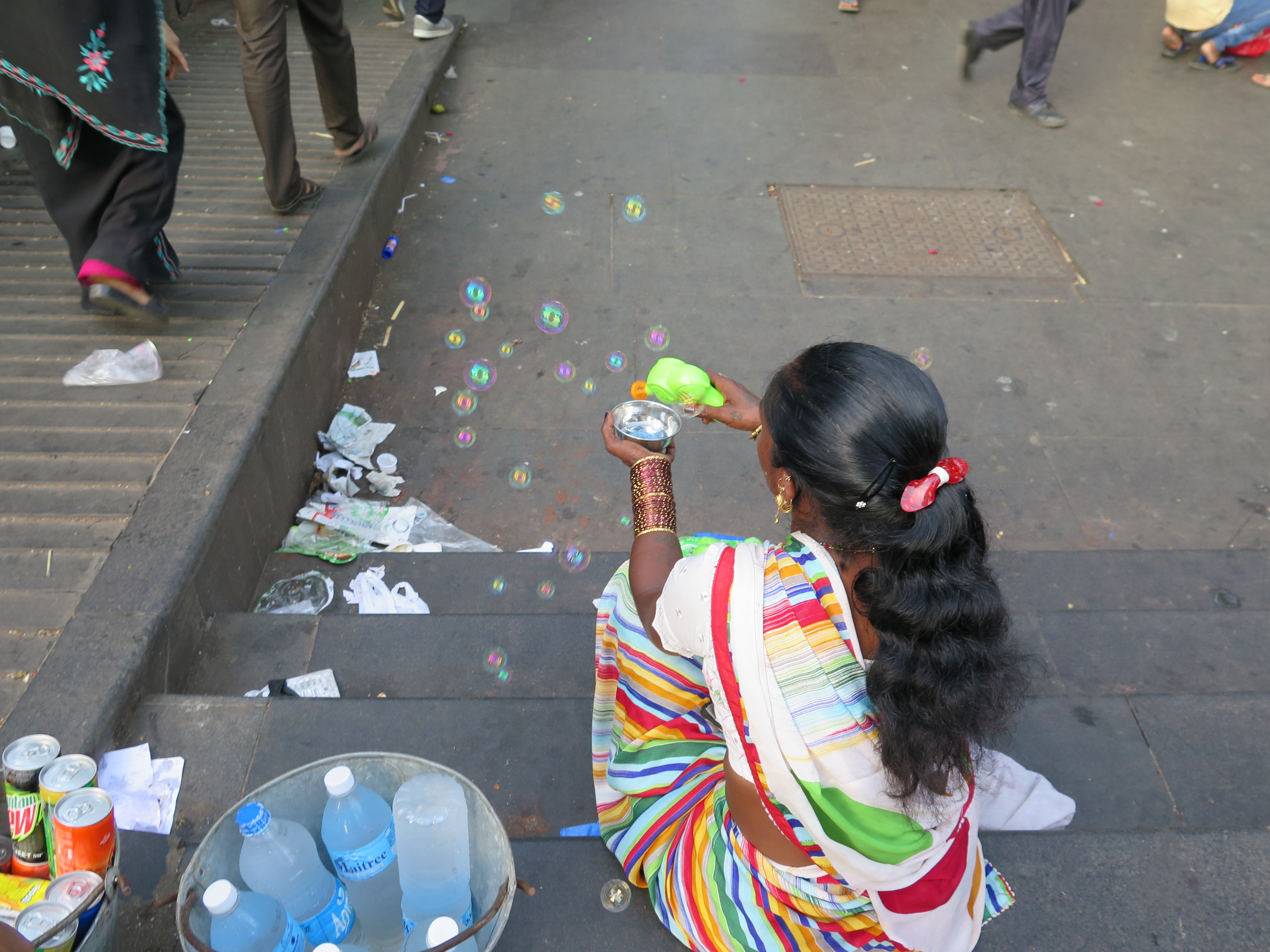 El museo Principe de Gales, La biblioteca… El centro de Bombay es muy similar al de muchas ciudades británicas; con algunos jardines, zonas verdes y edificios con una arquitectura elegante pero al igual que sucede en muchas ciudades británicas, el mantenimiento brilla por su ausencia. Así al lado de un lugar turístico, puedes encontrarte con montones de basura o con una fachada totalmente destartalada . Era domingo y se respiraba un ambiente festivo; alguna gente paseaba en coches de caballos exageradamente adornados con flores de plástico como las que aquí se llevan a los cementerios y en las zonas turísticas abundaban los vendedores de globos, de juguetes de cuerda y de pomperos, de esos de hacer pompas de jabón, que tanto gustan a los niños y a los no tan niños…