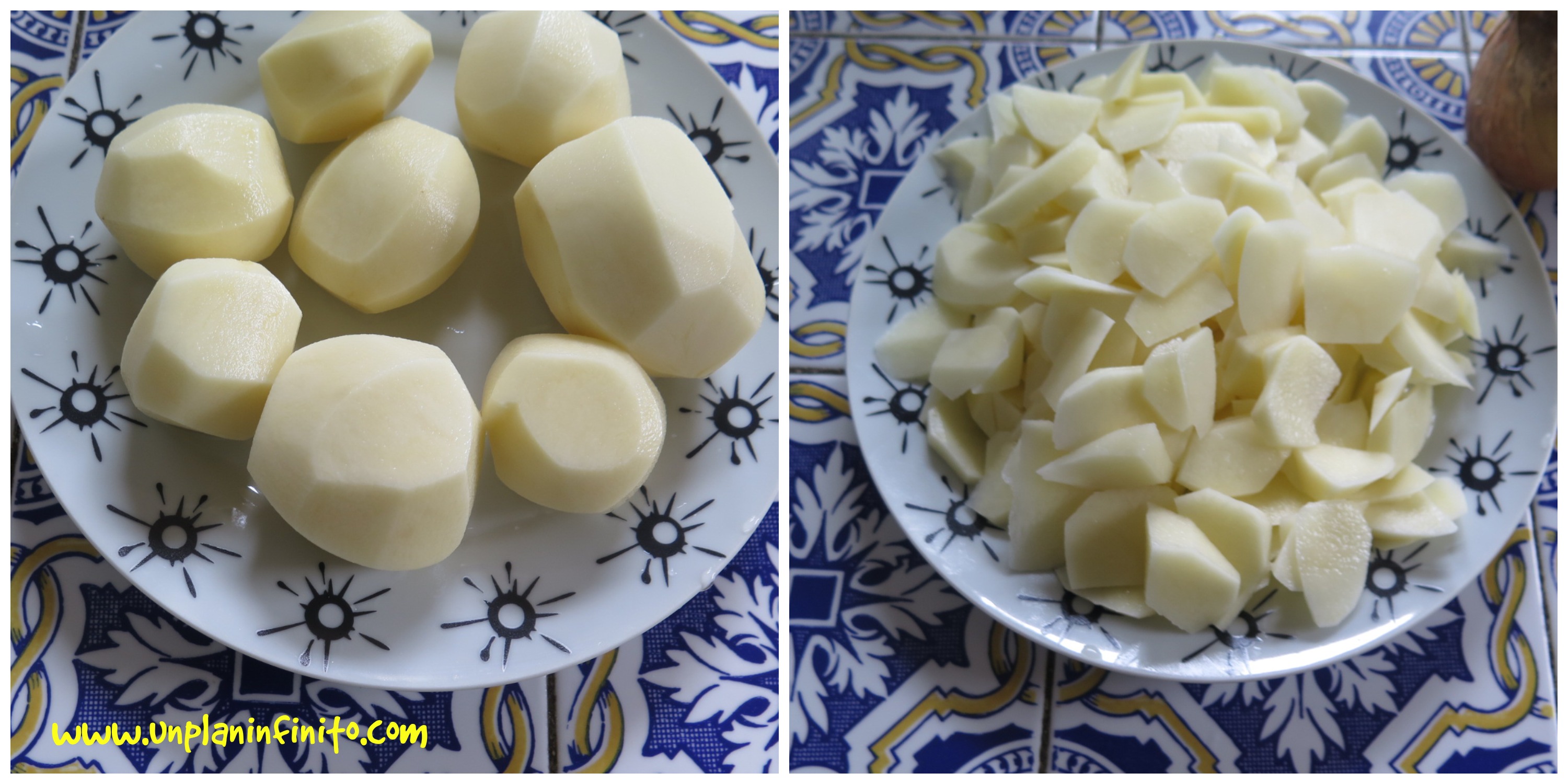 1- Peel the potatoes, cut them into thick slices and chop the onion 😭 (Don’t cry they are only onions) 😈