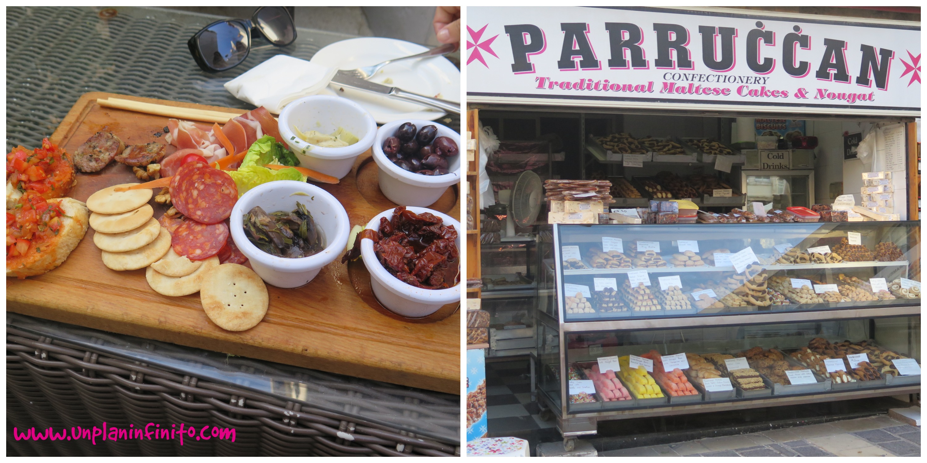 9- En cuanto a la comida 🍴 pocas veces verás restaurantes donde sirvan maltese food; la mayoria de los  restaurantes son sicilianos  y también  hay un montón de pastisseries… en Malta no pasarás hambre! .  Además hay muchísimas cafeterías y terrazas donde sirven helados al estilo italiano y todo tipo de cafés, macchiato, capuchino, breve, americano , caffe latte….etc Lo único que hemos visto propio de la comida maltesa es el maltese platter ( Una tabla con embutidos, aceitunas etc) y la pizza maltesa que está riquísima! Otro plato típico es el conejo 🐇 . La miel de Malta es de gran calidad y los dulces al «estilo turrón» con miel y almendras son los más típicos.