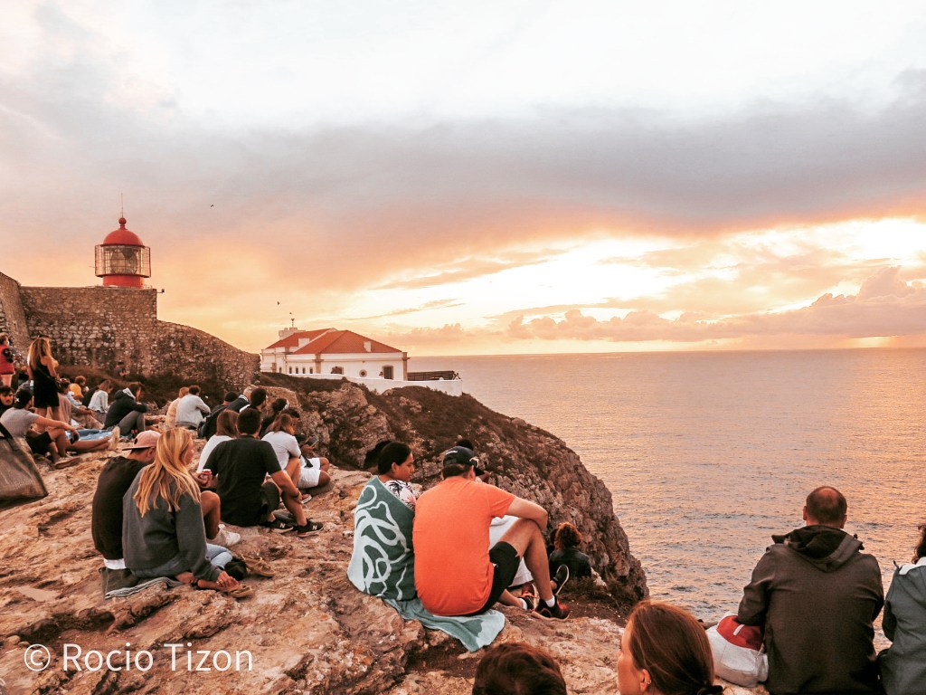 El Cabo San Vicente, como ya os dije anteriormente, es el lugar más recomendado para ver la puesta de sol y cada noche se llena de gente que viene a contemplar el precioso espectáculo. Cuando te vas acercando a la zona ya ves que se ha convertido en algo multitudinario ; hay muchos coches , mucha gente, muchos «autocarros» que venden bebidas, natas, bolinhas de Berlín, perritos calientes… Aunque pensé que sería un puro turisteo y que desde cualquier otro lugar hubieramos visto mejor la puesta de sol, no os voy a negar que hay algo de mágico en esos lugares donde se consigue reunir a tanta gente, incluso guardando el silencio, con el único fin de mirar al horizonte y disfrutar de la belleza de algo tan simple como natural, algo que ocurre cada día pero que nos sigue sorprendiendo y asombrando con toda esa luz y esos colores sobre el océano… Así que no me queda más remedio que recomendaros también este precioso espectáculo gratuíto e incomparable, de contemplar la puesta de sol desde el Cabo San Vicente, y siempre será aún mejor si lo hacéis en buena compañía 😉