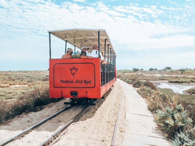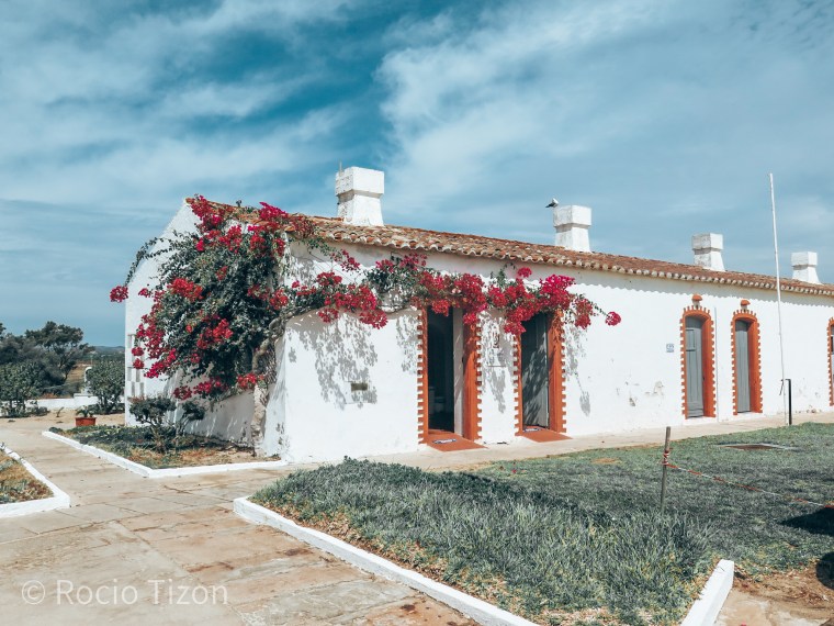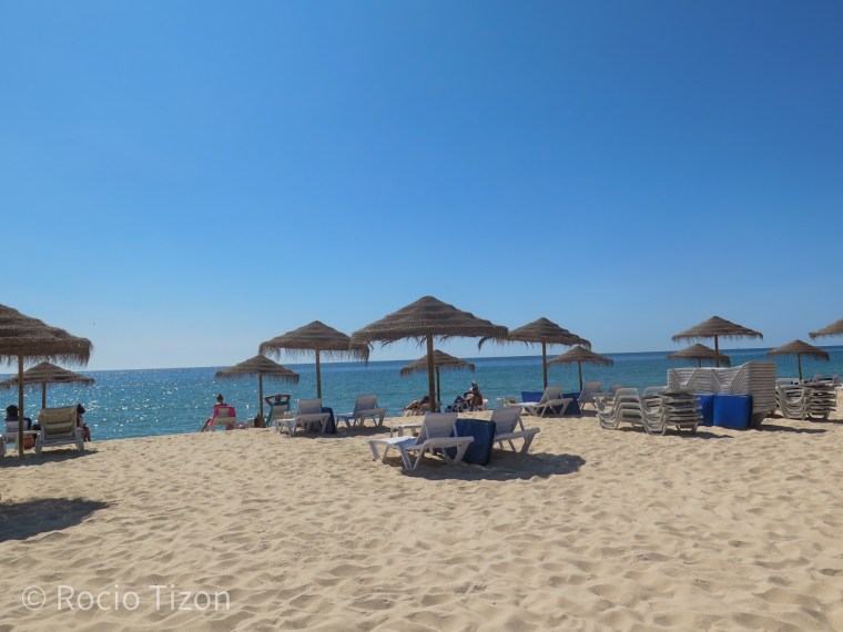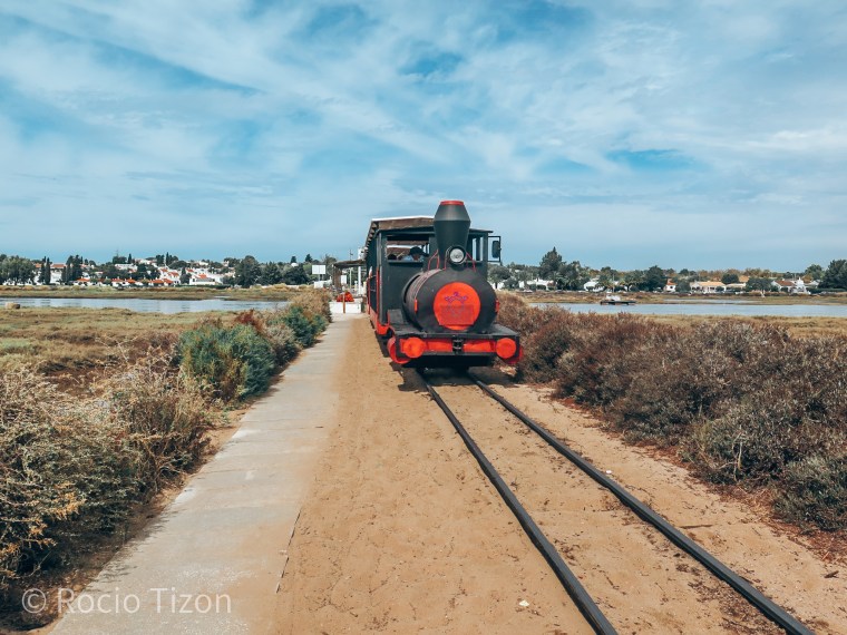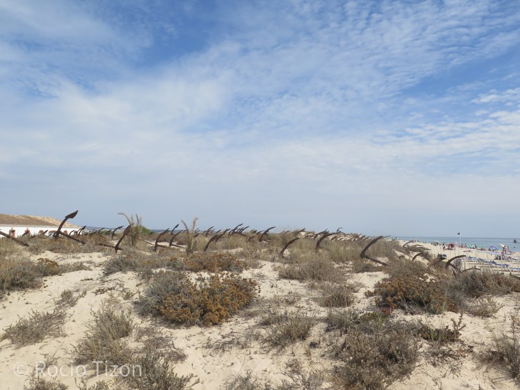 La praia de Barril es curiosa por varios motivos; Lo primero por el modo de acceder a este lugar; cuando llegamos a Pedras d’el rei aparcamos el coche en un lugar de aparcamiento gratuíto y luego cruzamos caminando por un puente blanco de metal, al final del puente nos esperaba un antiguo tren de vapor de los que usaban antes para llevar mercancía y que hoy transporta pasajeros a la playa de Barril por solo 1,20 € … pero yo iba con deportistas y en ese ambiente ¿quién dice nada de coger un tren cuando se trata de un paseíto de algo menos de un kilómetro y medio? 😉 Al final del paseo te encuentras con una playa de arena blanca y fina, aguas cristalinas, hamacas y sombrillas de paja que bien podría estar en cualquier lugar del Caribe… Además de la belleza de la playa lo que realmente llama la atención es encontrarte con lo que antes había sido un poblado de atuneros; con las cabañas donde los pescadores se alojaban desde primavera hasta bien terminado el verano, convertidas ahora en restaurantes, en bonitas tiendas de souvenirs cubiertas de buganvilla y hasta en un Museo del Atún.. Y lo más impresionante, posiblemente por su rareza, El Cementerio de Áncoras (anclas); monumento en homenaje a la comunidad pesquera que creó aquí el viejo poblado de pescadores … Creo que el único cementerio de este estilo que he visto en mi vida y que está justo en el arenal antes de bajar a la playa.