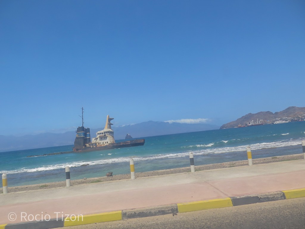 Seguimos nuestro recorrido por donde días atrás había entrado en la ciudad y clavando mi mirada en un barco encallado en una playa de color azul intenso… Recuerdo haber preguntado por él, sin antes diseñar mentalmente la oración en mi cabeza y aún así Estenio, que parecía había entendido aquel desorden gramatical, me había contestado que el barco se había quedado varado en la costa y como era demasiado complicado y caro remolcarlo, lo habían dejado allí… Me pareció curioso, era como si empezara a recibir pistas sobre como era la vida en Cabo Verde.