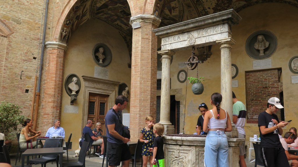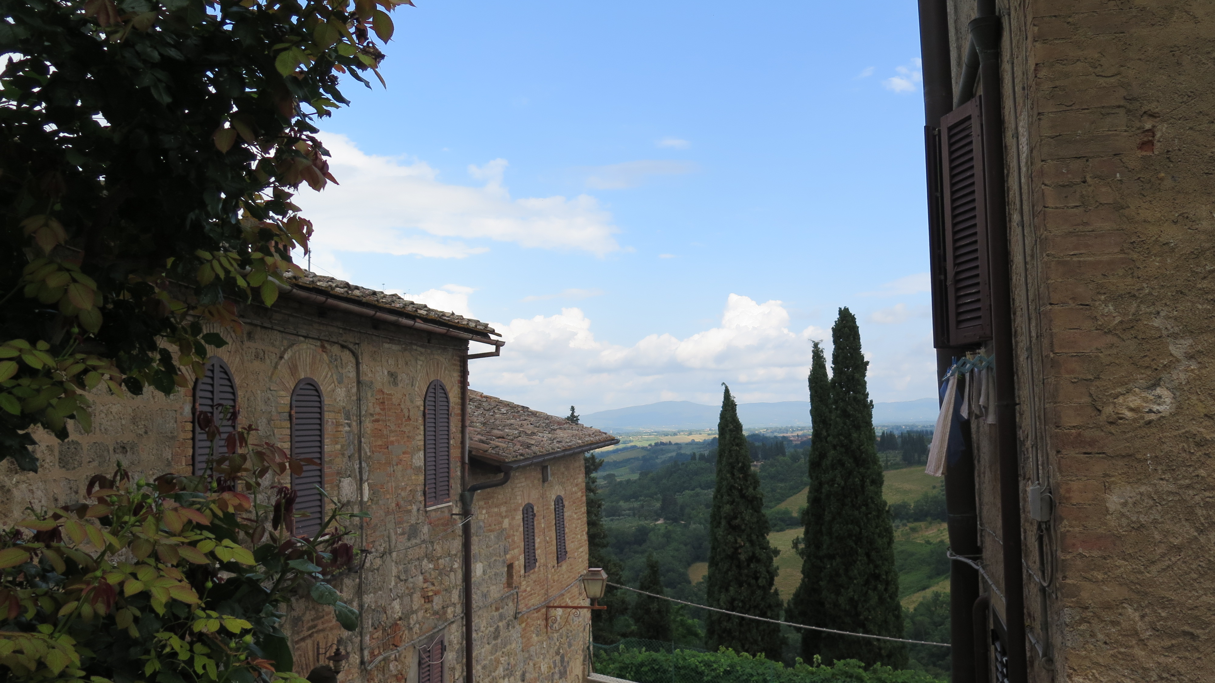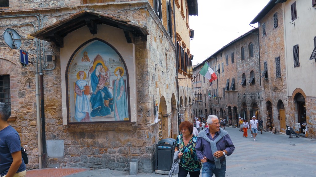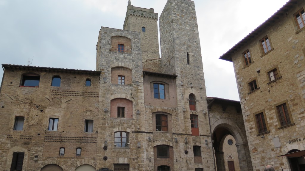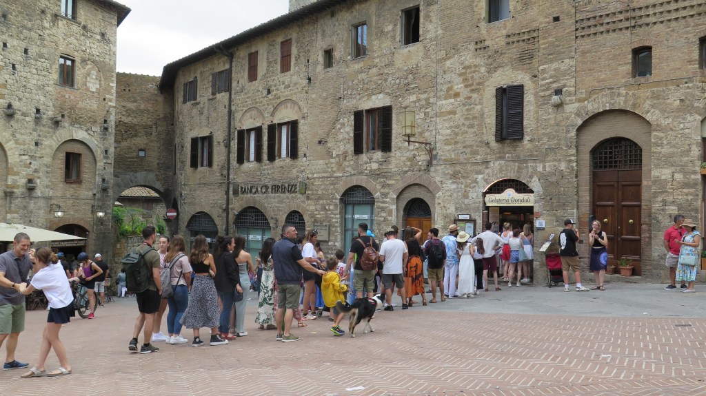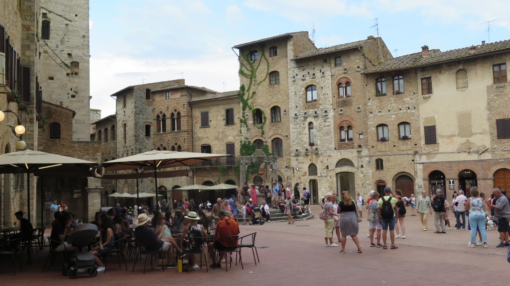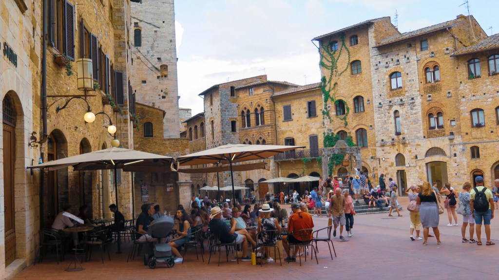 Lo que más me gusto de San Gimignano además de su indudable belleza arquitectónica, es que a pesar de ser una ciudad tan turística… La gente local, sobre todo jubilados se sientan a la sombra tomando el fresco y charlando en los soportales, totalmente ajenos a la invasión de turistas que ocupa las plazas y las terrazas de las cafeterías, lo que da al pueblo un aspecto mucho más realista y plácido.