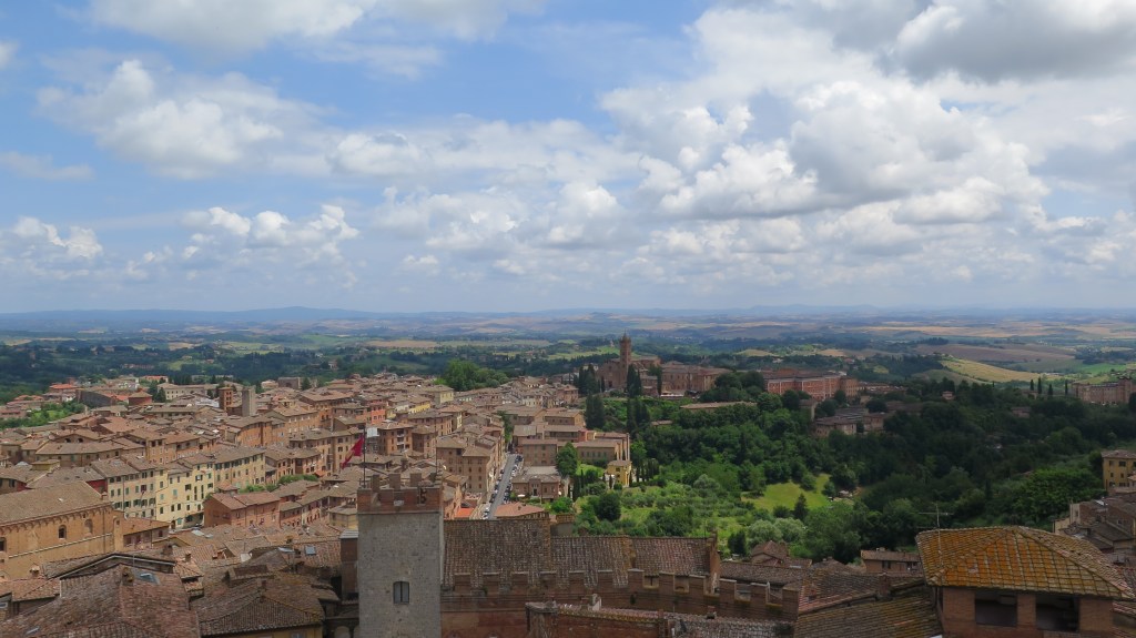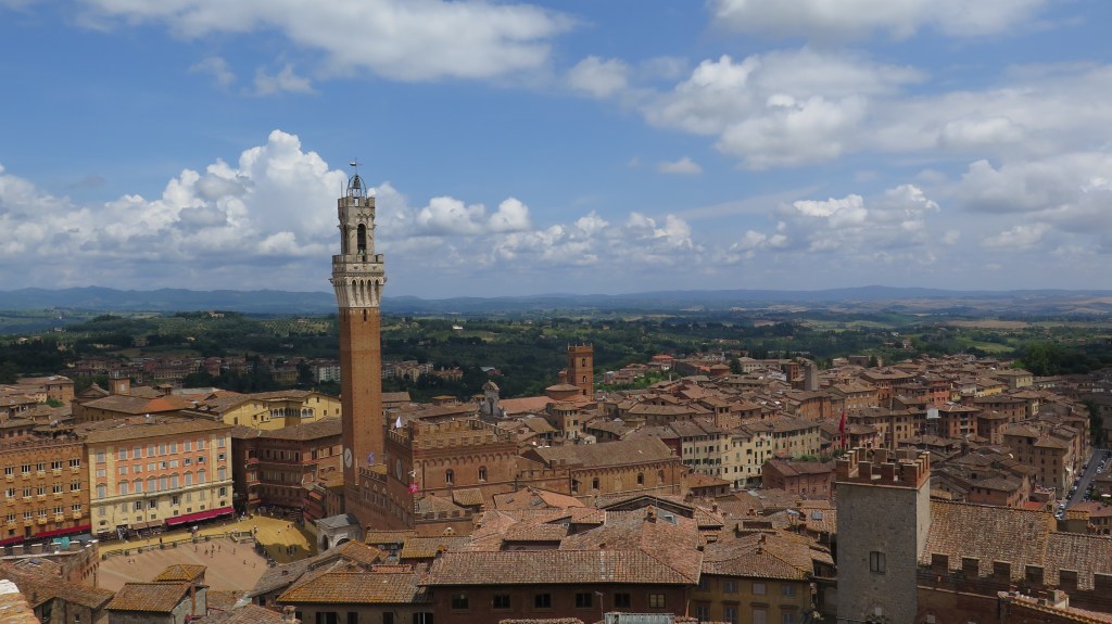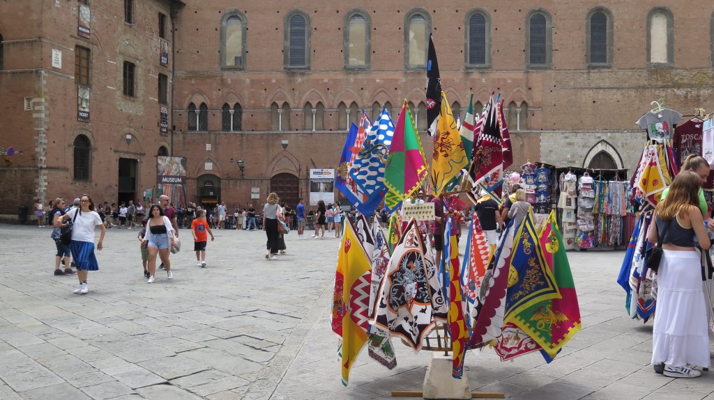 La ciudad estaba engalanada con banderas de las familias de cada bando y había un ambientazo! Hasta una comida popular en la calle, a un lado de la plaza de la catedral! Una de las visitas imperdibles; además de visitar la Plaza y la catedral o duomo de Siena , es subir a las vistas panorámicas del Museo de la Ópera; aunque tuve que hacer cola un buen rato, valió la pena! Desde lo alto tienes las mejores vistas de la ciudad.
