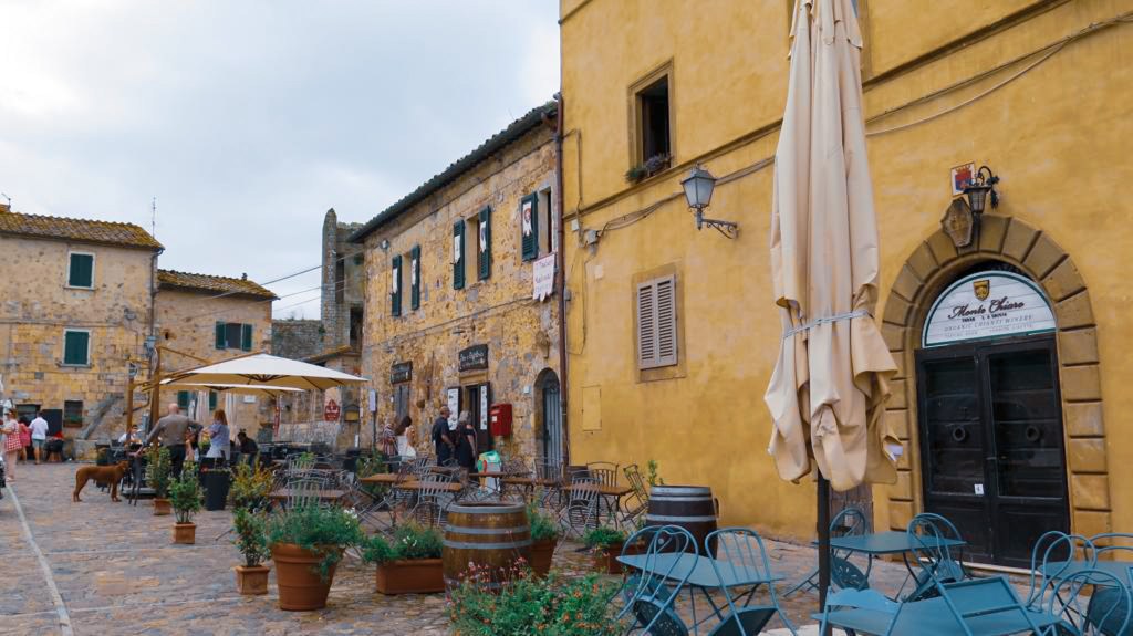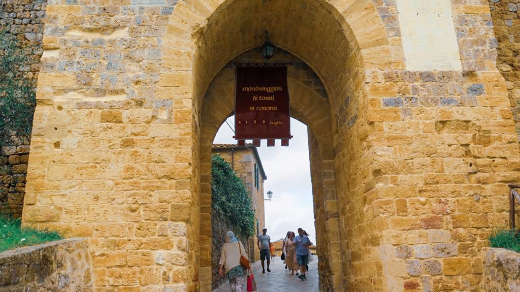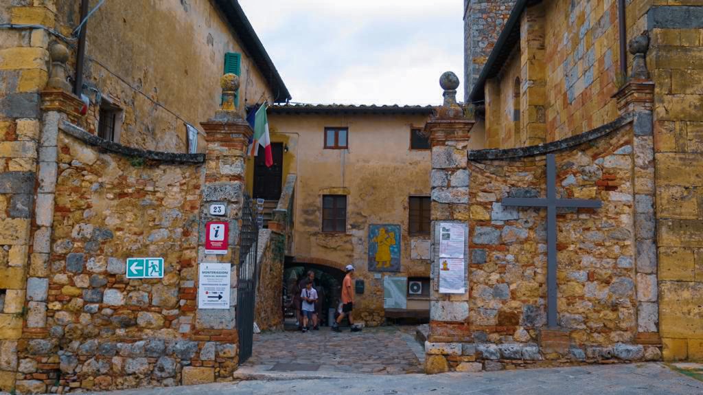 Nuestra primera parada fue en Monteriggioni, un lugar digno de fotografiar con un drone… lástima que yo no tengo! 😞 Se trata de un pueblecito precioso situado en lo alto de una colina y rodeado de viñedos. Monteriggioni está dentro de una muralla, con catorce torres y dos puertas, que fue hecha para defenderse de Florencia que quería conquistarla… El pueblo solo tiene una calle; en dónde hay algunas tiendas, dos cafeterías, una pastelería y una iglesia… Un lugar digno de ver! 🤩 ( Al final conseguí esa foto hecha con un drone pero no es mía…) 👇