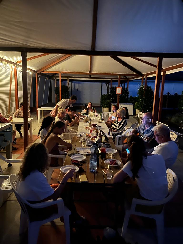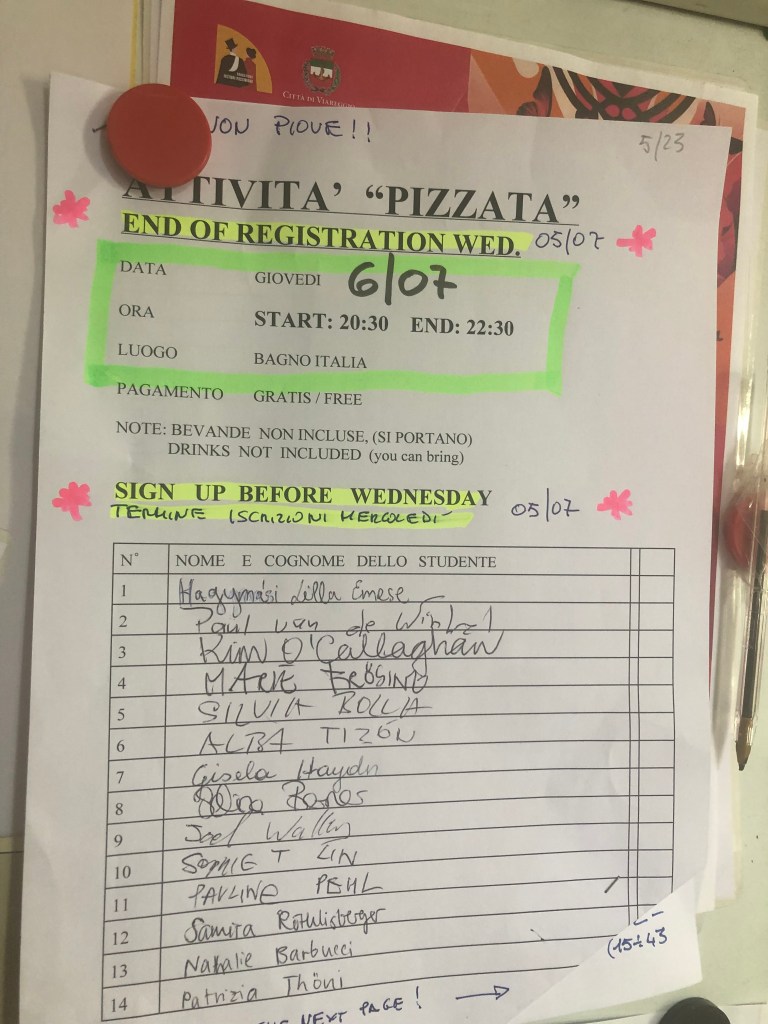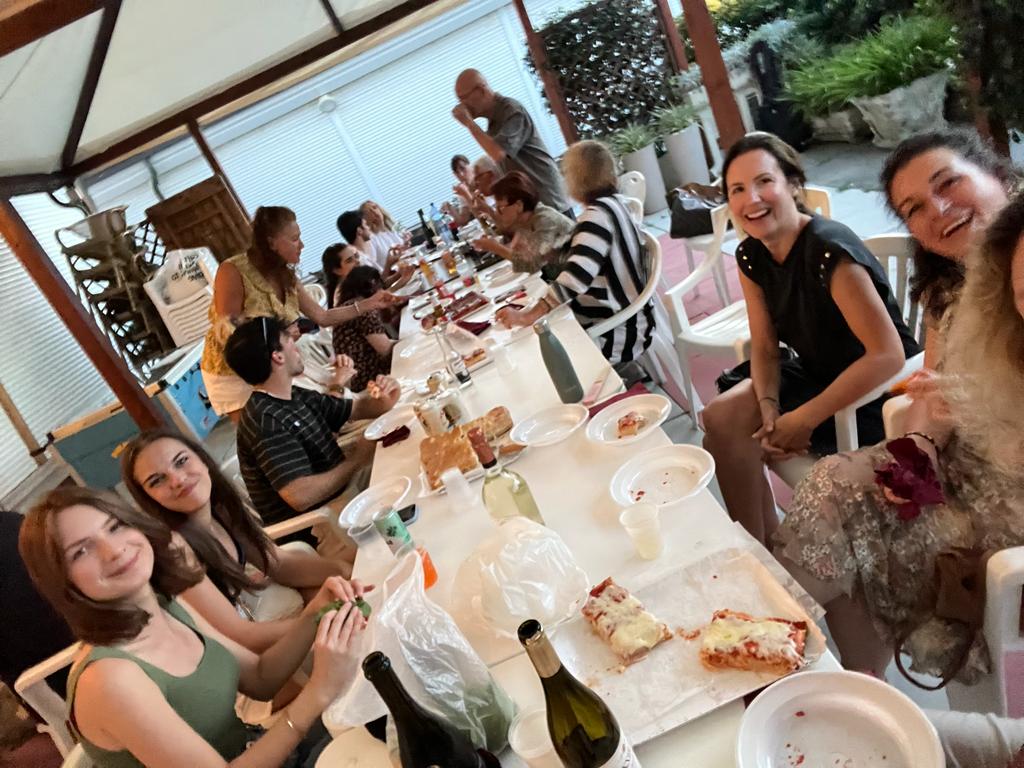 Poco a poco fueron llegando los asistentes y también las pizzas, que estaban riquísimas… y empezó a salir el vino y empezaron los brindis… Paul cogió su guitarra; empezó tocando canciones tranquilas en inglés… pero el público empezó a pedirle música en italiano y la cosa empezó a animarse; cantamos Bella ciao, Che sará… y luego ya canciones en español, en ruso… Nos estábamos viniendo arriba! Buscábamos la letra en el móvil y ya estaba armado el karaoke… Nos quedaba una botella de vino espumoso pero como yo siempre «ho paura» de abrir esas botellas; en realidad tengo miedo de dejar a alguien sin un ojo… Le pedí a Mark, que lo tenía enfrente, que la abriera él y casi soy yo la que se queda sin un ojo! 😅 La fiesta seguía y cada vez era más rara… Algunos de nuestros compañeros de casa jugaban a las cartas … la primera vez que veo a alguien en medio de una fiesta jugando a las cartas!! Luego estaba Natalie; una canadiese muy espiritual, explicando métodos de relajación en inglés a unas inglesas muy british que hablaban entre ellas diciendo que nosotras hablábamos muy bien italiano y que no entendían por qué íbamos a clases 🤣 Obviamente ellas hablaban fatal, si no nunca hubieran dicho eso! Aunque con esto de los idiomas es innegable que cuanto más vino bebes más políglota te vuelves! Pero a ellas aún les faltaban 80 o 90 copas!! 😄😉