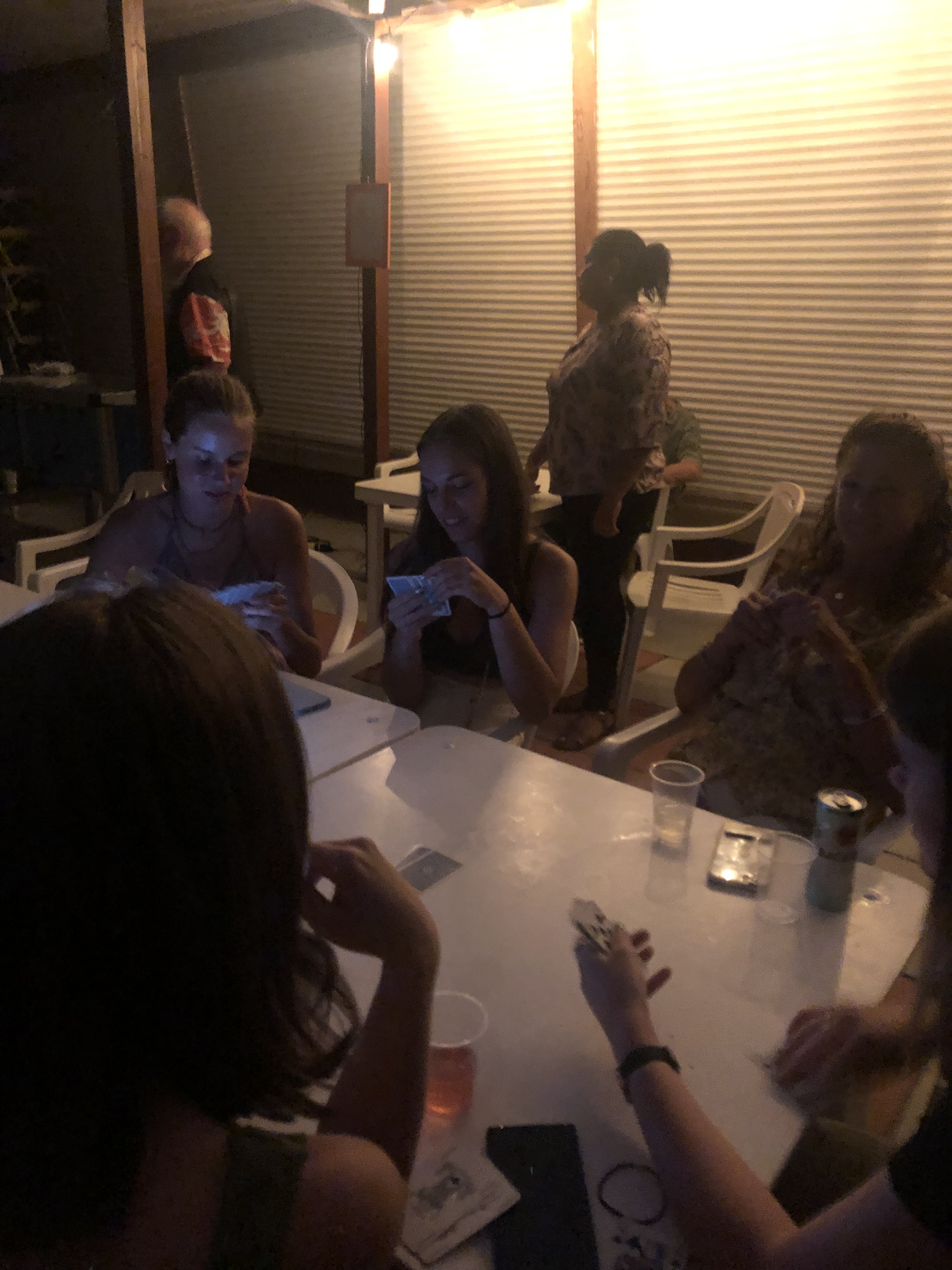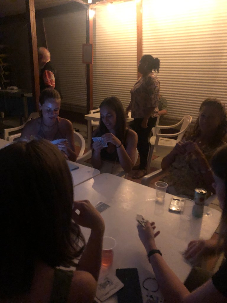 Me vestí con mis mejores galas; que tampoco es que fuera un vestido de cola…si lo hubiera tenido me lo hubiera puesto! 😉 Me maquillé un poco, me pinté los labios y bajé … Macarena, la chica chilena, ya estaba esperando. Silvia tardó un poco más en bajar y nos sorprendió con su outfit; una camisa de leopardo… Nunca he soportado el estilo animal print, pero tengo que admitir que ella estaba rompedora! 😅 No lo había pensado nunca, pero lo de vestirse de animal salvaje por la noche tiene sentido… Y nos fuimos caminando hasta la playa, hacía una noche perfecta para ir sin chaqueta y tampoco hacía demasiado calor; el tiempo ideal… El resto de nuestros compañeros llegarían un poco más tarde, todavía se estaban acicalando, pero nadie tenía pensado quedarse en casa esa noche.