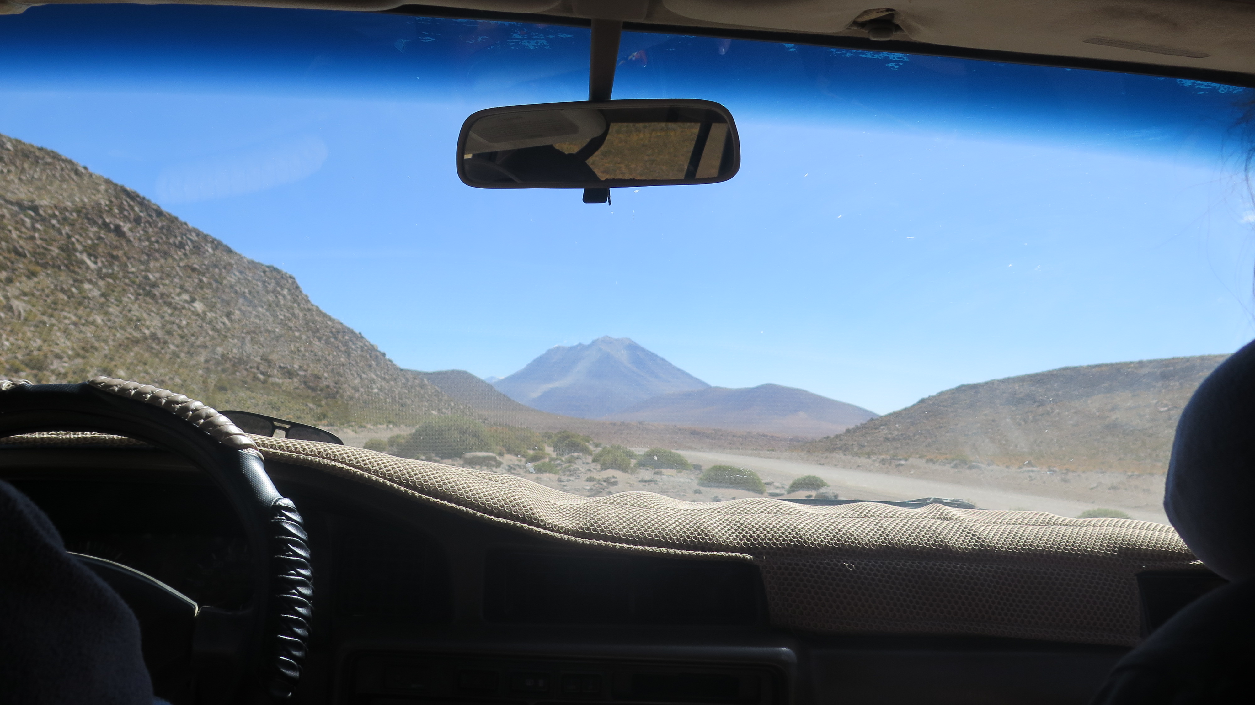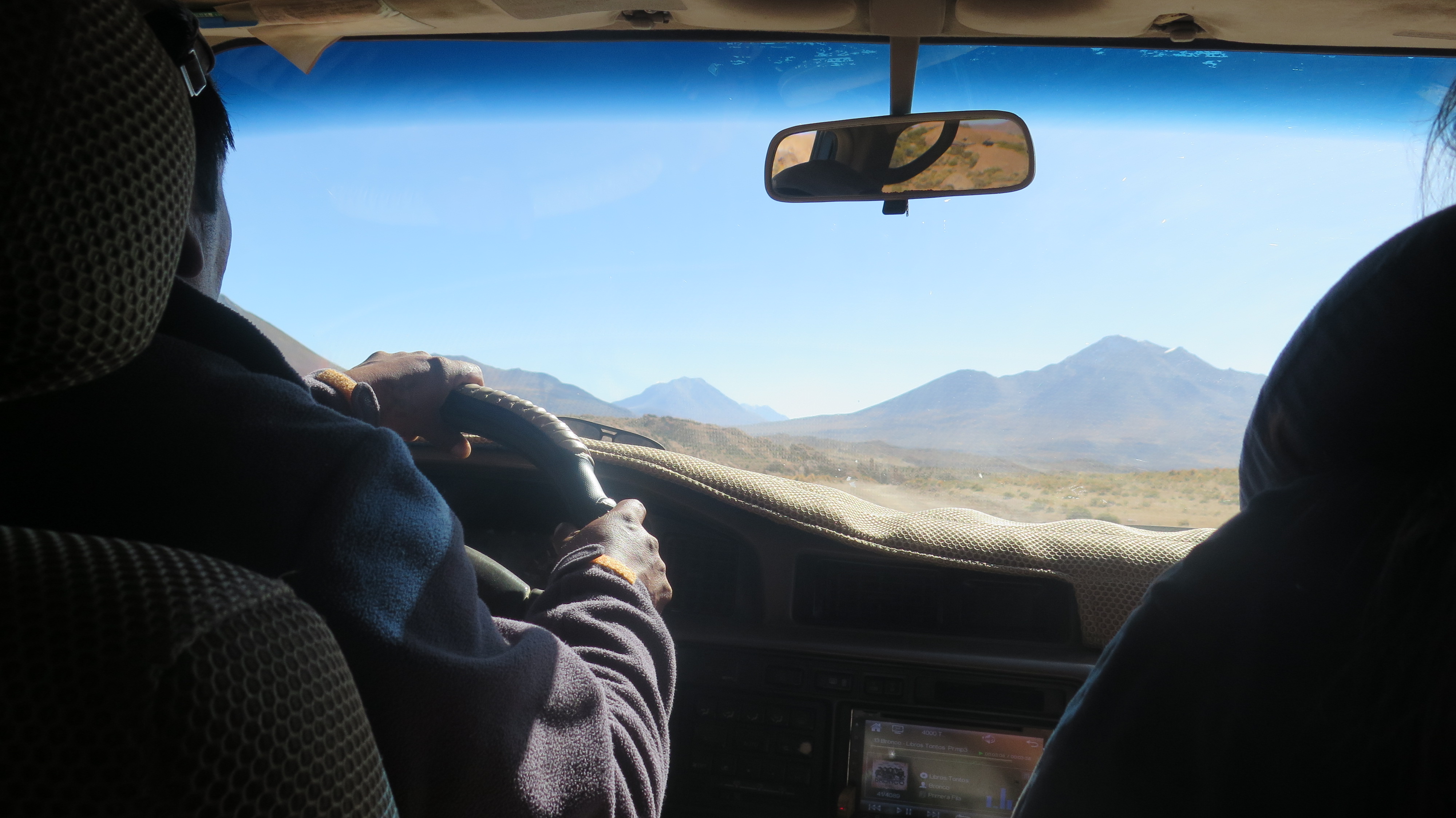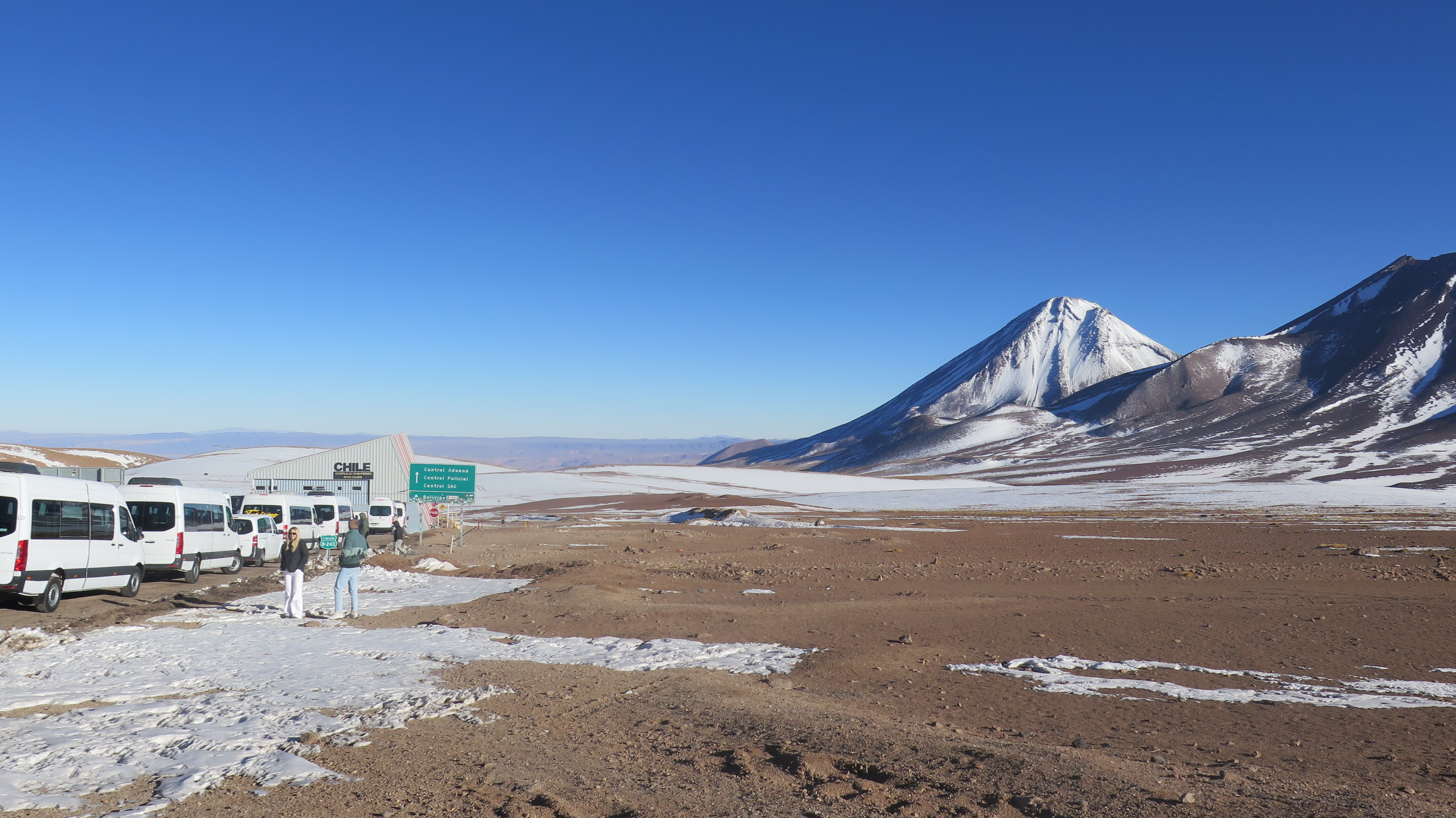 Después de unos kilómetros de puro desierto desde San pedro de Atacama, llegamos a un lugar también desértico que anunciaba la frontera… Muchos tratan de llegar pronto a la frontera para ser los primeros en pasarla, y mientras no la abren, duermen en la furgoneta, pero nosotros nos habíamos parado a desayunar y no llegamos tan temprano… así que había ya unas cuantas furgonetas delante … de todas formas, no me pareció mucho tiempo de espera.