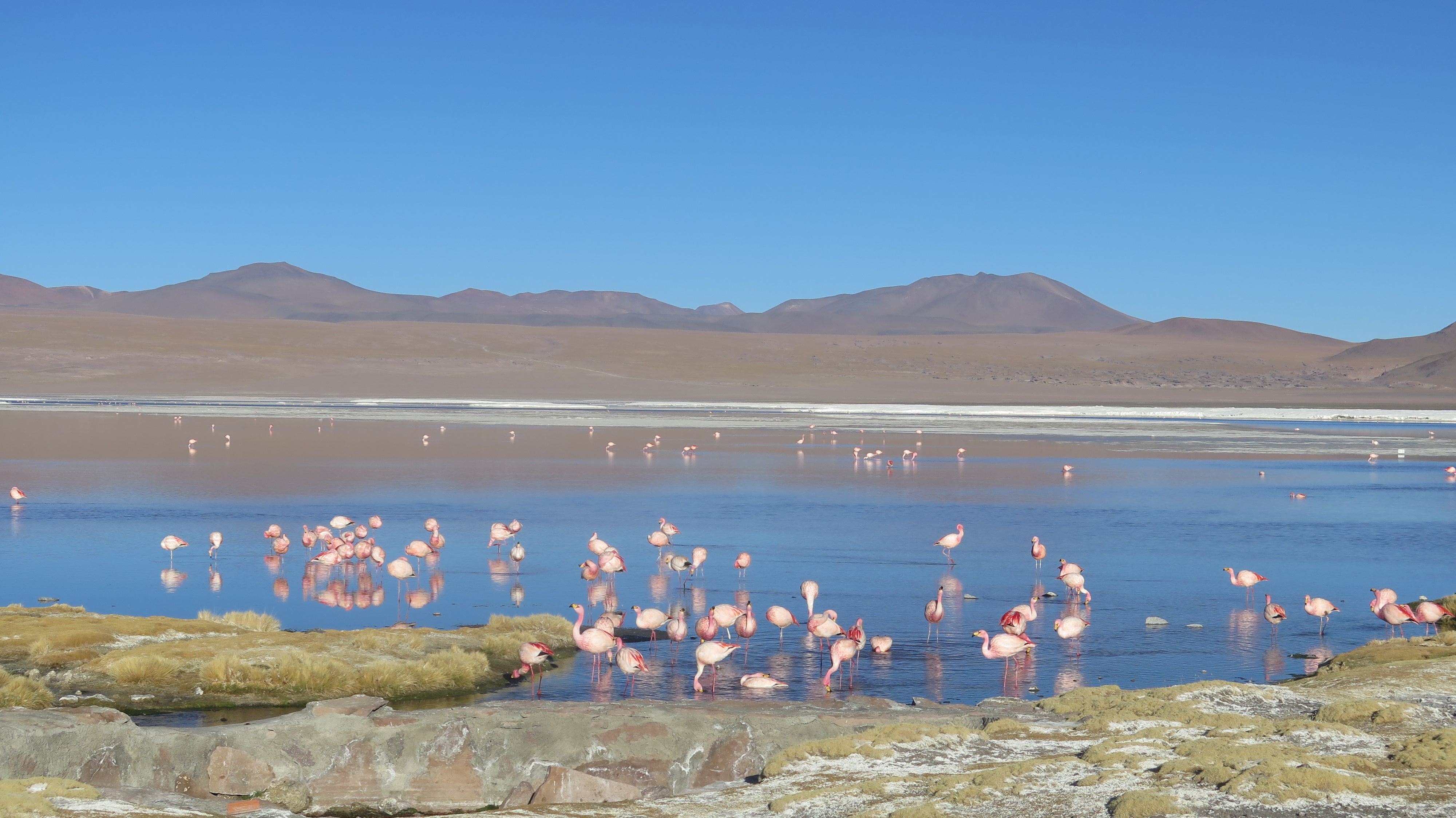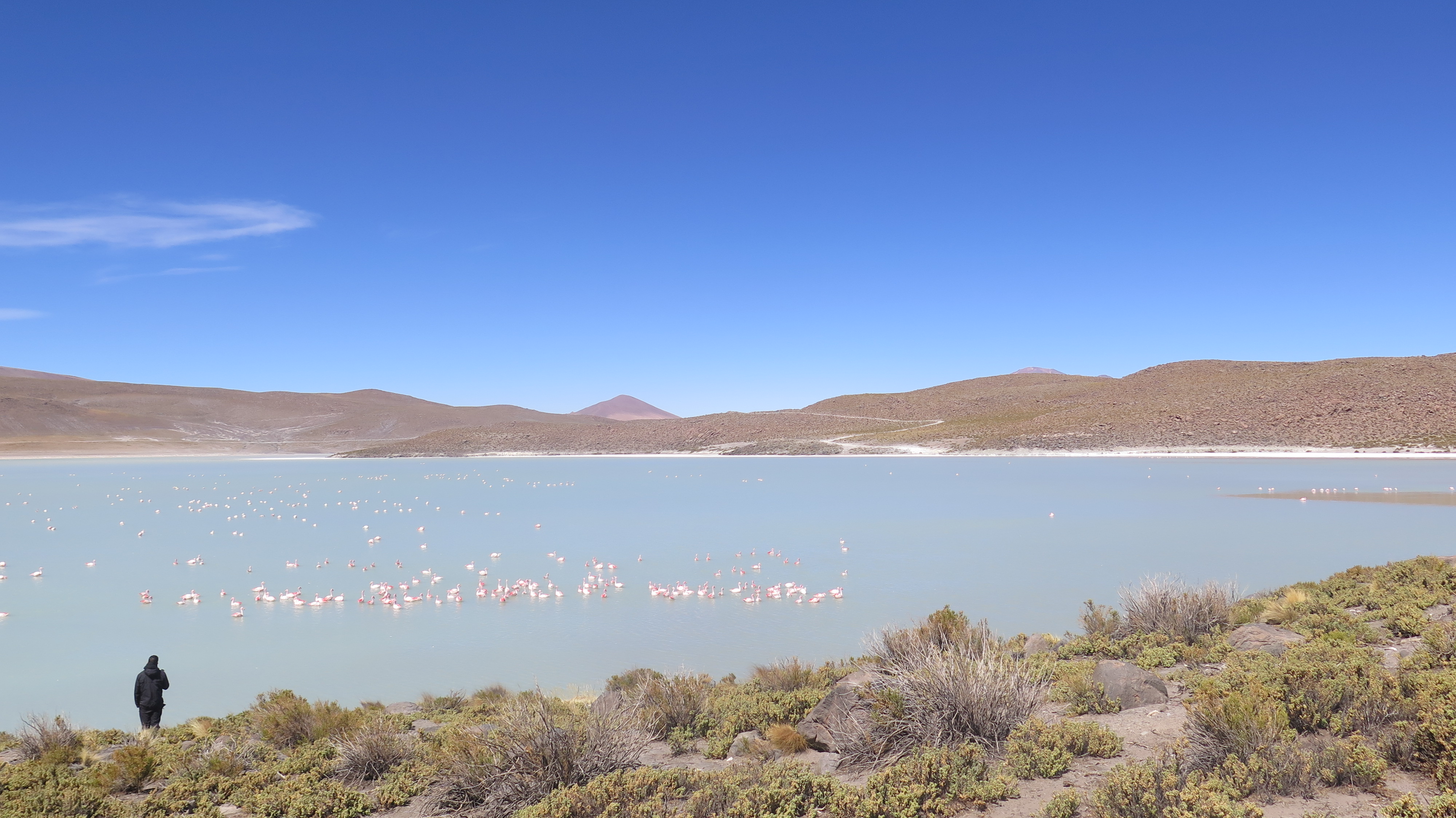 La belleza de esta laguna es espectacular, no solo por su color, también por sus habitantes…Un paraje idílico y en calma, donde los flamencos andinos, aves migratorias que se cuentan por miles, disfrutan tranquilamente de sus aguas, ricas en minerales, lo que le da ese color rosado tan característico.