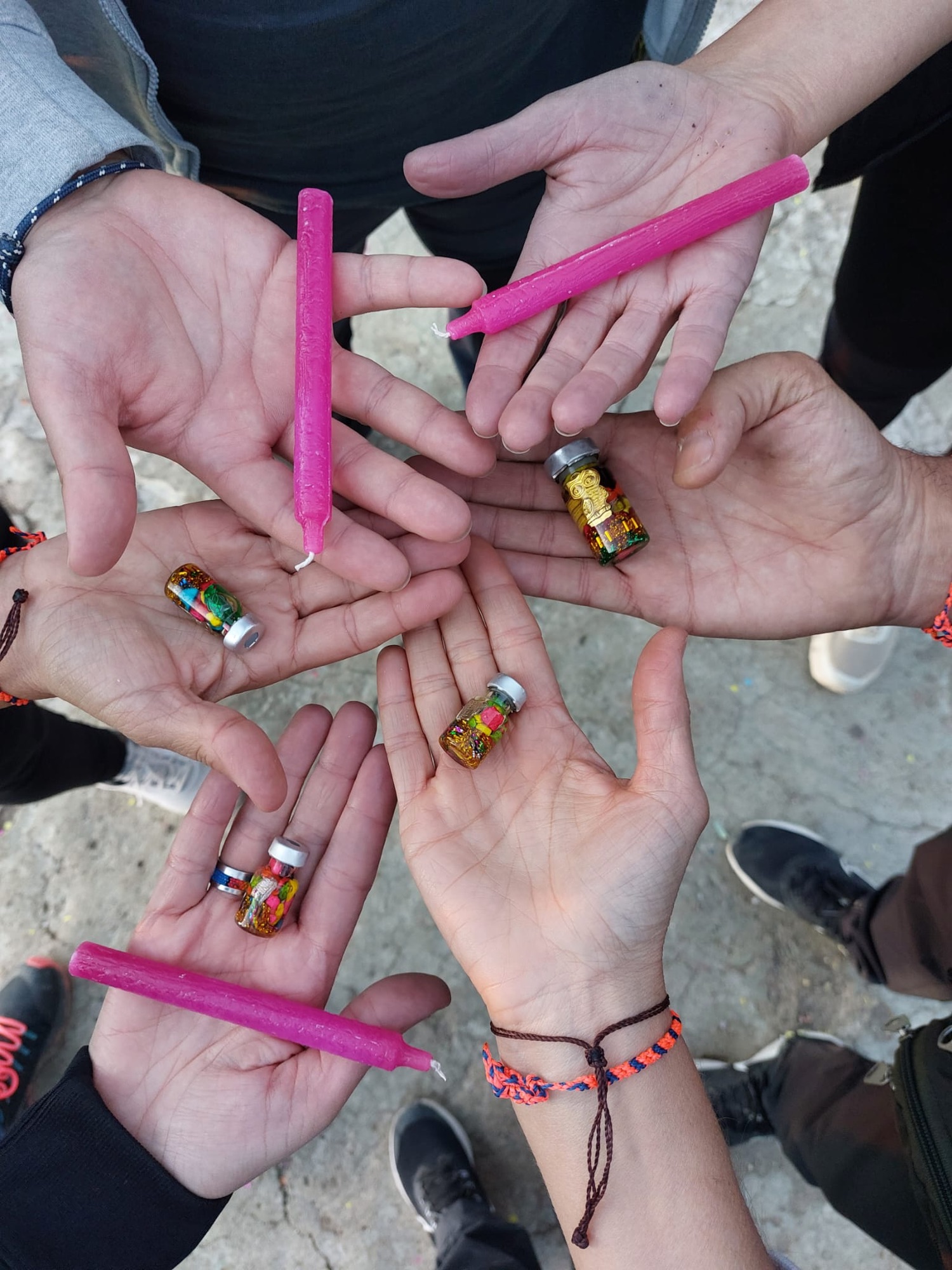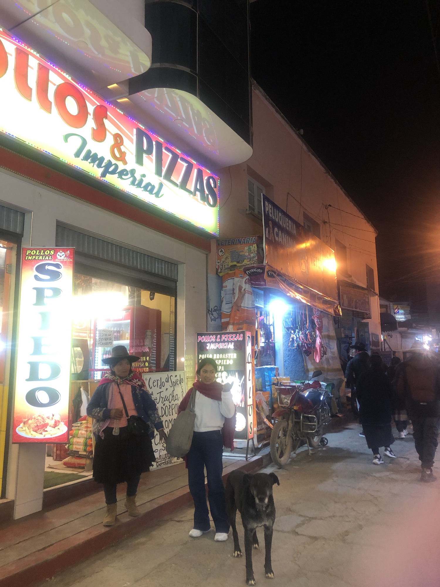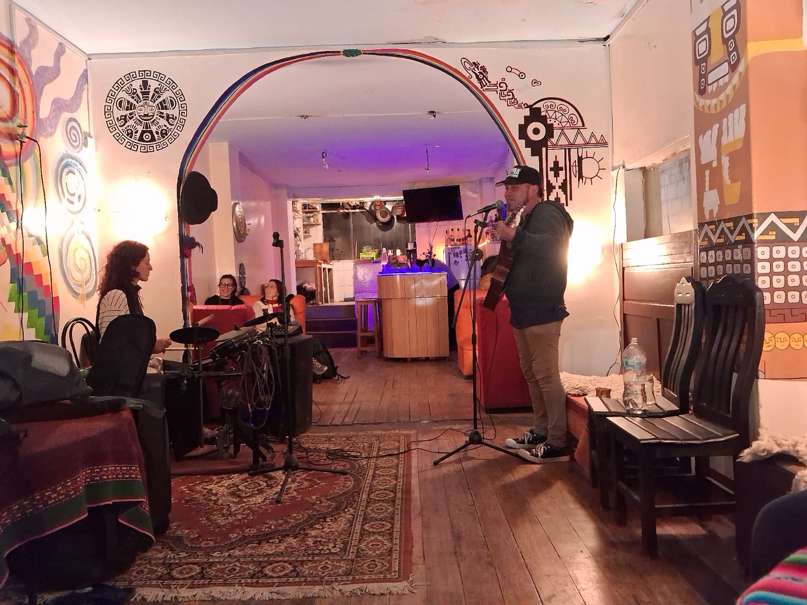 Esa noche al bajar del cerro del calvario con nuestros amuletos bendecidos , nos encontramos con un lugar con música en directo perfecto para terminar la noche. Era uno de esos sitios donde tienes dudas si los pocos clientes que hay son en realidad clientes o forman parte del staff: Una chica haciendo artesanía en una mesa, otra echando las cartas… y luego dos o tres chicos más tocando la batería, la flauta y cantando… Cuando tuve que salir a un patio del edificio para encontrar el aseo, apareció una de las chicas, que me dijo que era medio argentina, medio boliviana y que la parte de arriba del edificio era vivienda… Creo que todos vivían allí! Pero ninguno tenía pinta de ser boliviano, de hecho la que hacía artesanía resultó ser española! Nos tomamos algo y enseguida acabamos cantando y apoderándonos de los instrumentos ; aportando la música en vivo al local con nuestro amplio repertorio;»No puedo vivir sin tí» de Ronaldos, «Soldadito marinero» y unas cuantas de Estopa… llenándole el garito con alguna gente que se quedaba a escucharnos… ¡Fue una noche divertida y muy musical! Luego pedimos unas pizzas para cenar y los chicos volvieron a darnos un pequeño concierto de música andina, y ahí fue donde escuchamos por primera vez la canción “Canta pajarillo…” que se convirtió en la banda sonora de nuestro viaje! Una canción súper pegadiza… Os dejo por aquí el link para que veáis que canción más sanadora! Pero si luego se os pega, no me echéis a mí la culpa! 😬 Canta pajarillo. Hijas de la tierra