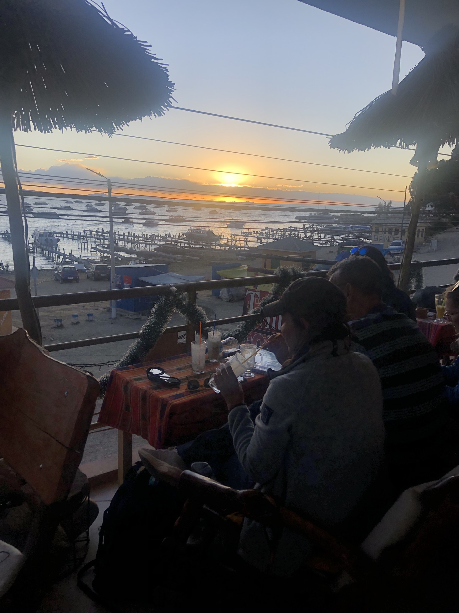 Dejamos nuestro equipaje en el hostel y pedimos una recomendación en recepción para ir a comer. Nos recomendaron dos lugares; uno era un restaurante para turistas extranjeros; el Restaurante Europa y el otro, un kiosko de la playa que nos sugirió uno de los chicos; Quirquincho, el kiosko número 14 y allá nos fuimos; a comer trucha en uno de los chiringuitos que hay enfrente del lago, un sitio con comida rica y económica, además de una buenísima atención… Después de comer nos fuimos a una terraza a tomar café y helados y como plan para la tarde; nos decidimos por subir al Cerro del Calvario sobre las cinco de la tarde, para ver la puesta de Sol … Subir esa cuesta es un auténtico calvario! Ya el nombre lo dice todo! 😰 Pero vale la pena por las magníficas vistas de la ciudad y del lago y por la espectacular puesta de sol.